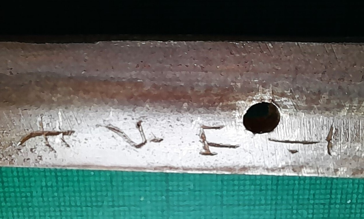 Same is genuine, (I performed the 'hot needle' test; no melting) Ito wrap. Ito and menuki rather pathetic. Blade either Damascus or acid-etched with no Hamon. Nakugo has '24' painted thereon, (as does saya, under the kogai), and inscribed as seen.