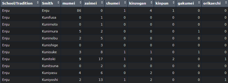 A fun little exercise I did using @Jussi Ekholm's wonderful data he's provided to the forum. The filter here is just looking at Juyo blades (Not TJ or above, but I could add that in easily enough), and the first numeric column is the number of Mumei blades and the 2nd numeric column are non_mumei. In the case of the Enju/Enju combo this includes 5 instances where there is a shumei, kinpun mei, or kinzogan mei simply to Enju. The columns in order are: School/Tradition, Smith, # mumei, # non_mumei. Enju Enju 86 5 Enju Kunifusa 0 1 Enju Kunimoto 0 1 Enju Kunimura 5 3 Enju Kuninobu 2 5 Enju Kunishige 0 3 Enju Kunisuke 3 11 Enju Kunitoki 9 23 Enju Kunitsuna 0 2 Enju Kuniyasu 4 8 Enju Kuniyoshi 2 17 There are still some fringe cases that I'm working out the bugs with where the count may be off 1 or 2, but this was a quick bit of tinkering. Edit: I did more tinkering and here's a big table with most of the possibilities of mei realized: Again, a huge shout out to Jussi for the compilation work he's done. I can't possibly say enough about how insightful it has been for me as a data nerd to pour over different possibilities and arrangements of the data he's collected and given to members of this forum. Its truly invaluable and selfless of him for giving this to the NMB community!