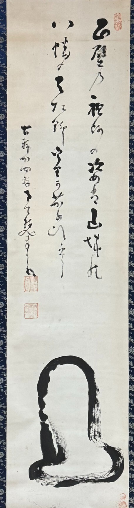 Nakahara Nantenbo (1839-1925), Buddhist name Toju Zenchu (Complete Devotion), was in the last 17 years of his life the Exalted Master of the main temple of Moyoshin-ji of the Rinzai sect. A painting theme brushed extensively by Nantenbo is the "wall-facing Daruma" or "menpeki Daruma 面壁達磨," referring to the ancient First Patriarch's nine years of meditation facing a wall. As early as the fourteenth century in Japan, Zen artists playfully depicted the sage's silhouette by means of a sing, meandering outline in a technique known as ippitsuga (one-stroke painting). Nantenbo's conception of the menpeki theme is even more abbreviated than those of his predecessor's. By eliminating the distinction between the head and shoulders, he further distilled the silhouette of the First Patriarch. A simple inverted U-shape is used to connote Daruma's body, and a horizontal ellipse is meant to imply his knees beneath monkish robes. The abstract nature of the figure only accentuates the quality of the ink, applied in a single sweeping stroke of great energy. The calligraphy exhibits Nantenbo's legendary Zen humor. 面壁乃祖師の姿者 山城能八幡野 者たの宇里可 茄子比釆 The shape of Daruma facing the wall, is it like a melon or an eggplant from the fields of Hachiman in Yamashiro? Was Nantenbō simply inept at pictorial representation, or was he a visionary who pushed Zen painting further into a realm of dynamic epigraphs and emblems? The inscription on his menpeki painting offers a playful acknowledgment of the image's ambiguous nature. It is likely, in fact, that Nantenbō intentionally challenges people's rigid preconceptions about the nature of Daruma. In his autobiography he notes that while he receives many requests for paintings of Daruma, his images are often criticized for looking like owls or octopi. "Very interesting," the old priest observes. "People talk as if they have seen Daruma, but who has seen the original Daruma?" Provenance: Nagaragawa Gallery (Tokyo). Personal collection.