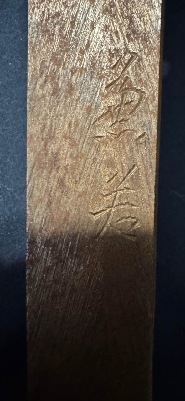 Hello everyone! I have been doing some research on this sword. @Ray Singer translated the maker as Yasuhiro. I am curious if this is an authentic signature or gimei. Additionally i am curious about the age and school. I far from an expert, so feel free to correct me if I am wrong, but here are some things that I’ve noticed. It is suriage and probably missing some of the signature. Nagasa is 25 inches, takanoah yasurime, the hamon appears to be gunome, it’s hard to tell visualize the boshi or get a picture of it but I believe it is O-maru or Ko-maru. The tsuba is simple and without decoration. The seppa seem to be made of copper. The fuchi has some kind of decoration…..is it feathers or leaves or wheat? I have no idea what the menuki are but would love to know that. The kashira seems to be a bird…..possibly a hummingbird? Any helpful comments, or correction would be appreciated. From my research there were 4 generations of Yasuhiro, and I would be curious which generation this work is from also thanks to @Rivkinand @PNSSHOGUN for their help!