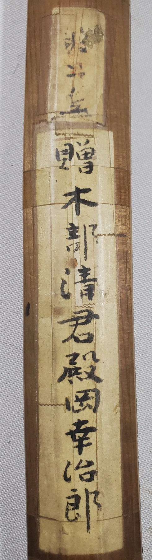 i have a sword with a paper tag attached with tape. actually there may be 2 tags, a small one with 3 kanji and a longer one. I think i see Kiyo and Yoshi/Yuke Haru so probably a surrender tag with a name but it would be great to understand it thanks!! Mark