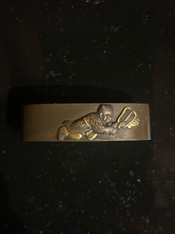 but it has lower quality than the one I post. If anyone has something similar or can identify the possible school or maker I would appreciate it very much. My guess is a Goto school artist mid edo. BTW, I also wonder how gold is applied to silver base and why there aren't many silver based menuki around whereas shakudo and gold menuki seem to be more common. Thank you.