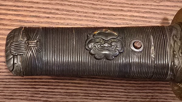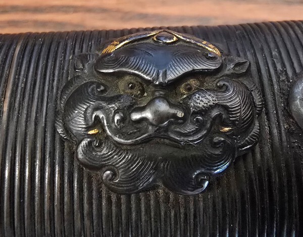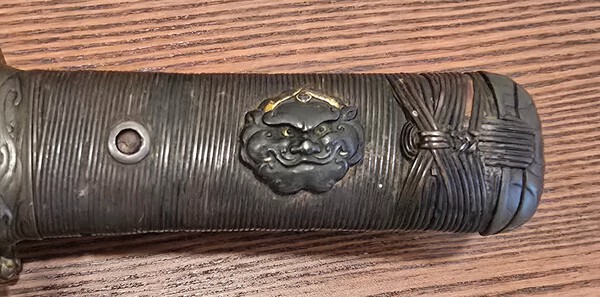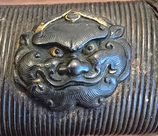 Has anyone encountered any menuki similar to these? Or know a possible school, or time period? I believe these are depicting Foo dog faces and are made out of shakudo. Not sure if the picture do them justice but they are extremely detailed.