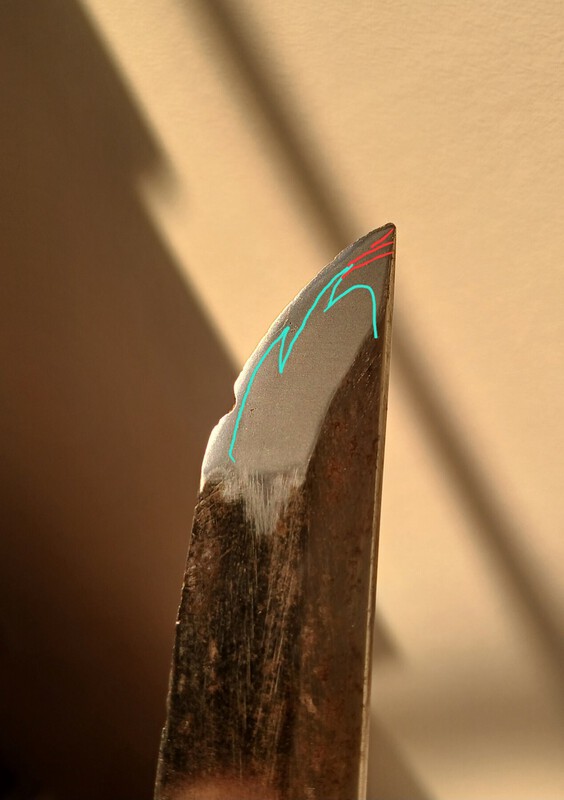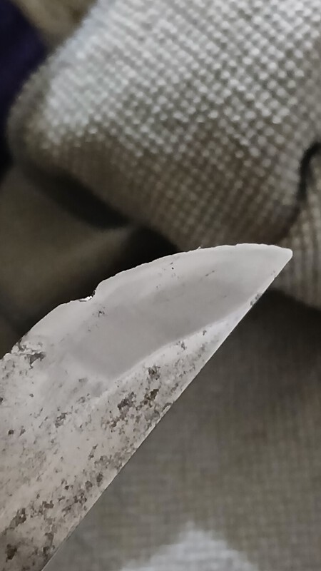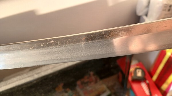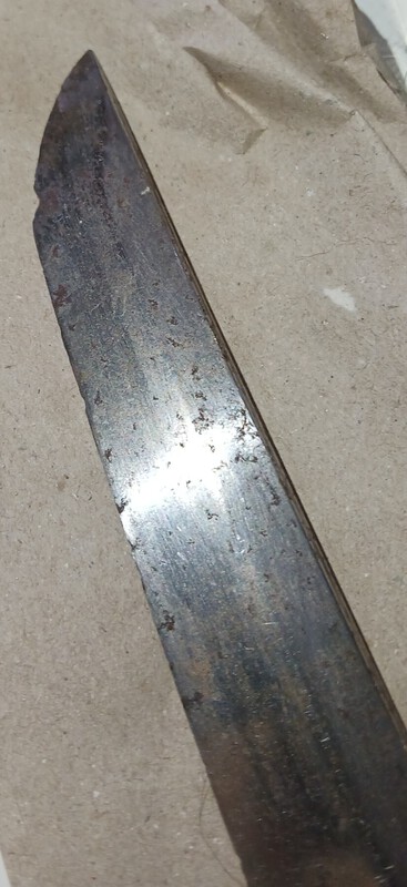 From the parts of the nakago they didn't sand I can see it used to be basically black with rust, and quite deteriorated from presumably age. There's not much meat to it so it has been polished in it's past however many times. It is extremely difficult to see but in extremely specific oblique lighting it looks like there could be a hamon, and if there is its comprised of some pretty large grains. Finally it has a mitsumune.