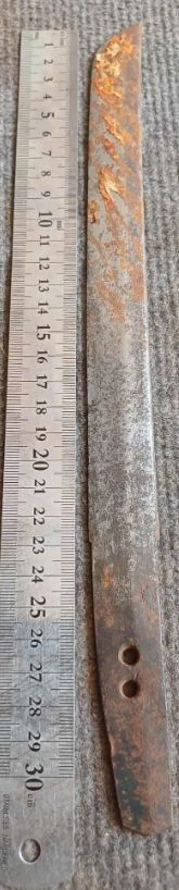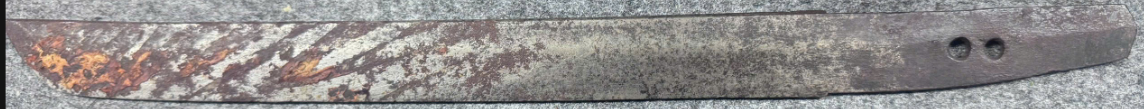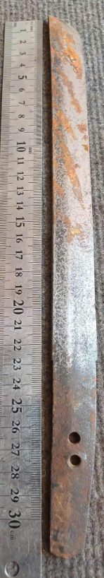 Thank you very much, Zoglet, for your insights — I really appreciate your time and expertise! I’m not disappointed at all — I mainly collect these old blades out of curiosity and fascination, rather than for value. Here are a few more photos of the full blade (both sides and the spine) for better reference. The nagasa is about 23 cm and the nakago is 8.5 cm. The blade edge and tip are not sharp — it’s hard to tell if they were ever sharpened or intentionally left blunt. The blade has been kept wrapped in newspaper for many years, and some of that paper seems to have bonded into the surface rust. I’d really appreciate any advice on how to deal with this properly without causing further damage. Thanks again for your time and kind help! Best regards Jack