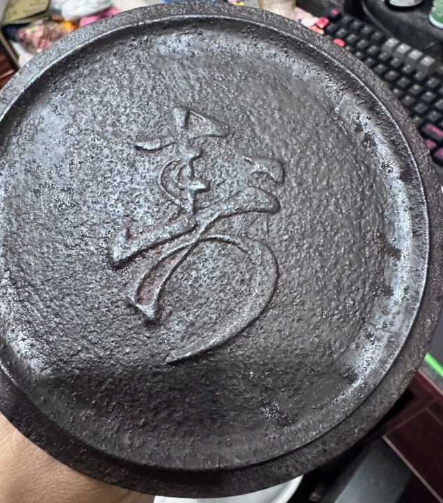 Hello everyone, I’m looking for help identifying this old Nanbu Tetsubin (Japanese cast iron kettle) that I recently obtained. Here are the main details I’ve observed: Material: Pure cast iron (non-enameled interior). Casting style: Sand-cast, entirely handmade. Handle: – Removable handle (可動弦 / kadōzuru) type. – The handle is forged iron, attached through small pivoting rings on each shoulder. – Surface shows hammer marks, suggesting hand-forging rather than casting. Surface pattern: – Full-body kiku-mon (chrysanthemum pattern), hand-stamped and overlapping. – Subtle irregularities suggest pre-industrial stamping methods. Seal / Signature: – Vertical inscription on the side, appears to read 「南部盛榮堂造」 (Nanbu Seieidō zō) — though slightly worn. – Relief casting, not engraved post-production. Base: – Flat base with natural casting texture. – No vent holes or polishing marks, consistent with late 19th–early 20th century craftsmanship. Estimated period: Late Meiji to early Taishō (circa 1890–1920). Origin: Possibly from Morioka, Iwate Prefecture. I’d appreciate any insights about: Whether this seal truly corresponds to Seieidō or a related workshop. The approximate period and type of casting mold. Any advice for conservation (I’m currently seasoning it with strong tea infusion to stabilize patina). Photos included: side seal, lid knob, handle joint, and base. Thank you very much for your time and expertise.