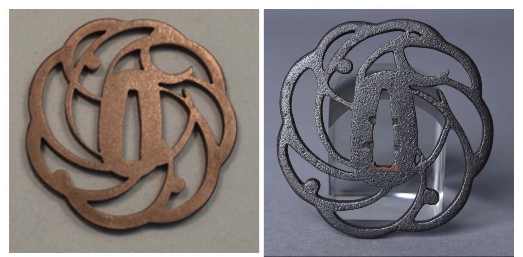 I just wanted to warn everyone who looks at the Japanese auctions like me that there is at least one seller who is taking modern steel iaito tsuba and giving them a 'makeover' to look like antique pieces. The photo is of one example which is on sale at the moment; the original, Minosaka brand tsuba is on the left and the reworked, acid treated 'antique' is on the right.