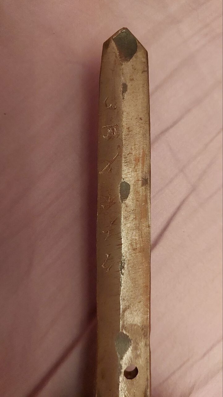 1. Dear colleagues, I am trying to identify katana smith with Mei, consisting of 6 characters, written in Katakana (presented on the photo). So far I am not able to identify the 5th character. I would like to ask you if any one knows what smiths Mei it is or may be. Any one knows? Is it "クチポソ ?ヨ " /does not make sense so far/ or "アリホシ?ヨ " So far the only candidate is "アリホシ?ヨ " . In this case first 4 characters correlate with: アリホシ Arihoshi 有法師 smith. Аrihoshi ID ARI3 Province Yamato Era Kakitsu (1441-1444) Active Period 1441-1444 School Tomonaga In this case it would belong to Taima (or Taema) group (当麻) : アリホシ  Arihoshi 1338 Yamato アリホシ  Arihoshi 1362 Yamato アリホシ  Arihoshi 1441 Yamato Fondateur : Kuniyuki (国行). Caractéristiques générales : jihada : mokume-hada avec itame-hada, chikei et yubashiri. Taima-hada : l'itame-hada sur le yokote devient masame-hada. Le jigane est sombre avec beaucoup de ji-nie ; hamon : chu-suguha hotsure en nie. Beaucoup d'activité en nie de type nijuba, kuichigaiba, uchinoke, kinsuji et inazuma apparait dans la zone du yokote ; bôshi : yakitsume. Forgerons : Kuniyuki (国行), Tomikiyo (友清), Toshiyuki (俊行), Kunikiyo (国清), Tomotsuna (友綱), Tomonaga (友長), Tomoyuki (友行), Arihoshi (有法師).
