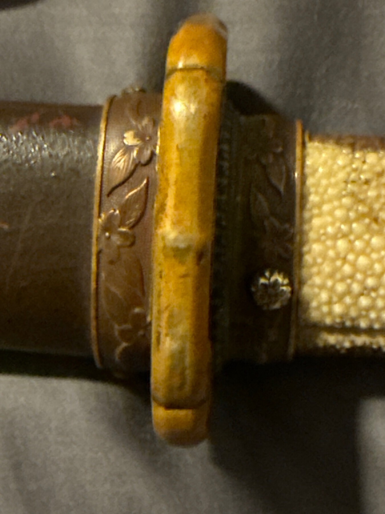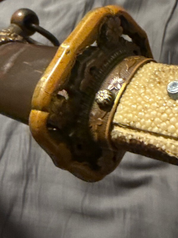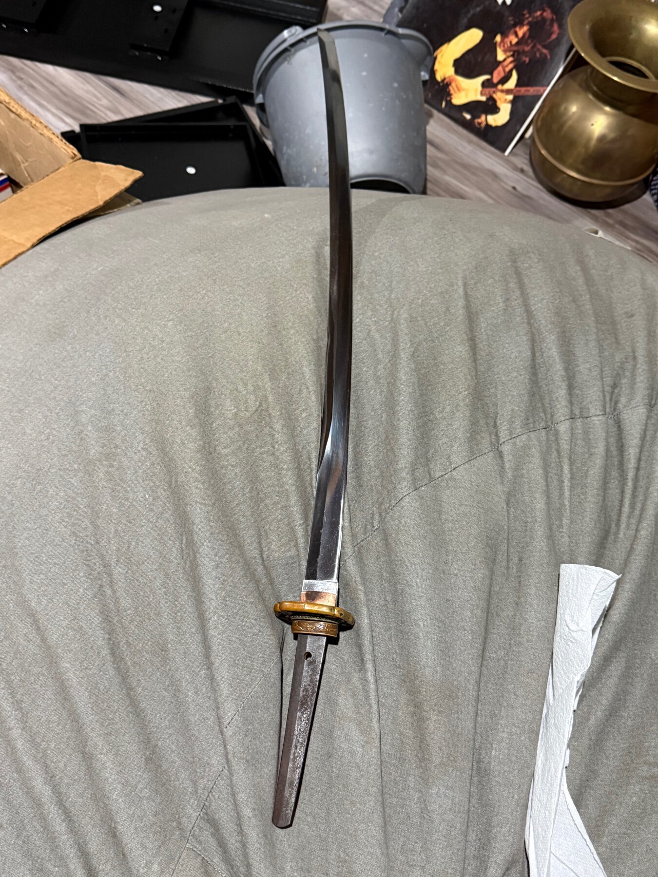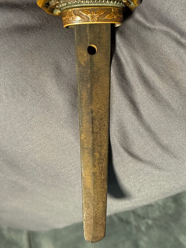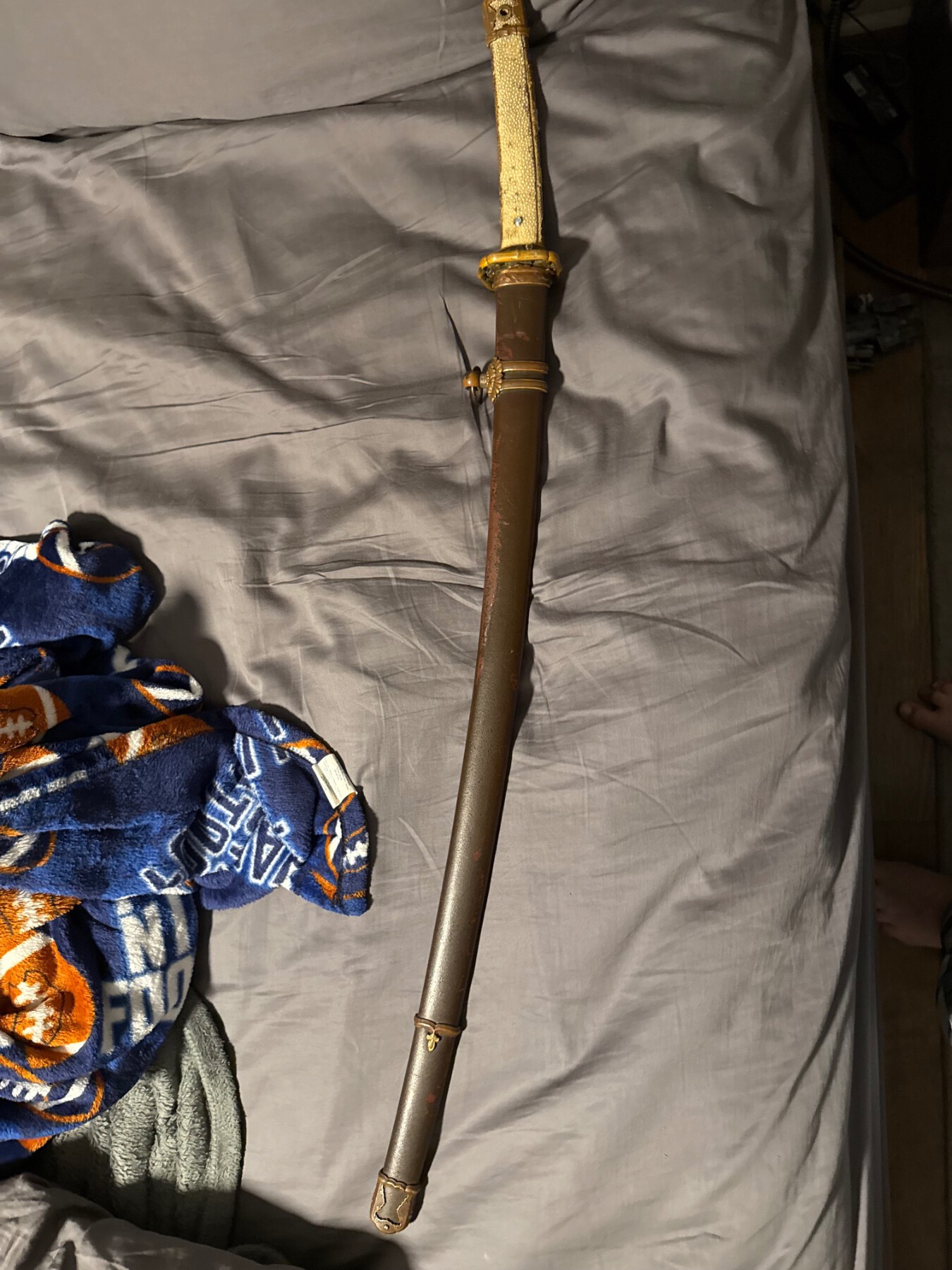I was helping my wife’s uncle clean out his recently passed father’s condo, and found a stash of rifles and a sword in the vent above his furnace. I know just enough to know I wasnt supposed to clean it and as soon as I drew it out of the scabbard, it has an amazingly luxurious feel to it that most stamped weapons just dont have. Ive taken it to 3 shops, two which said it was fake but tried to to buy it, and one that directed me online…so here i am.
