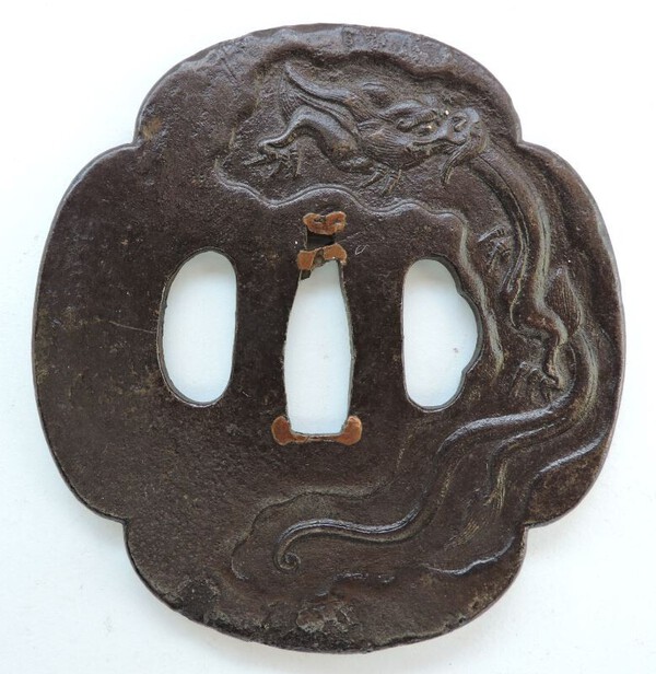 February 10th is the start of the Chinese Year of the Dragon. I’m sure many of you have fittings with dragons, so let me get the ball rolling with start with two tsuba of mine. Perhaps, as it is the Chinese New Year, I should post some Nanban Chinese dragons, but I thought I would post these two as they seem to have nice smiley faces and do not look particularly fearsome; a good New Year omen. I have attributed both of these tsuba to the 19thC Mito School based upon the observations that the artists tended to make large iron plate tsuba with a hammered surface and raised areas of iron which they carved in detail and left their work unsigned. The surface of both tsuba is a glassy chocolate brown, which why I think they are 19thC rather than earlier. Other schools which I think could be candidates for the makers are the Myochin and the Natsuo workshops. The first tsuba is a large (9.6 x 8.7 cm) rectangular plate tsuba showing a dragon among clouds and wrapped around a diamond shape (clan mon?) in the centre. Most of the design is formed by hammering the iron around the proposed design element to form an indentation and then carving the centre. However, the iron forming the dragons head has been raised above the plate before carving. The tsuba is highlighted in parts by a light application of gold, called kakihage (shadow), giving a more subtle effect than nunome inlay. The second dragon tsuba is also a large (8.4 x 7.8 cm) iron plate, which has been roughly hammered into shape and shows many lumps and bumps, which I hope that I am correctly identifying as tekkotsu, rather than being fooled by irregularities made to look like tekkotsu (clever these artisans!). The areas containing the clouds and dragon look like they have been indented into the plate using a pre-shaped stamp, but I think that it is actually skilful forging. The dragon has a welcoming, rather than fearsome, look and the eyes are gilt to impart some life into the critter. Although the dragon is a typical three clawed Japanese variety it also has three tails, namely a long curly one, another about half the length ending with what looks like a brush used for calligraphy and a short tail, again looking like a calligraphy brush. No idea why. Comments and further information welcome Best regards for the (Chinese) New Year, Regards, John (just a guy making observations, asking questions, trying to learn)