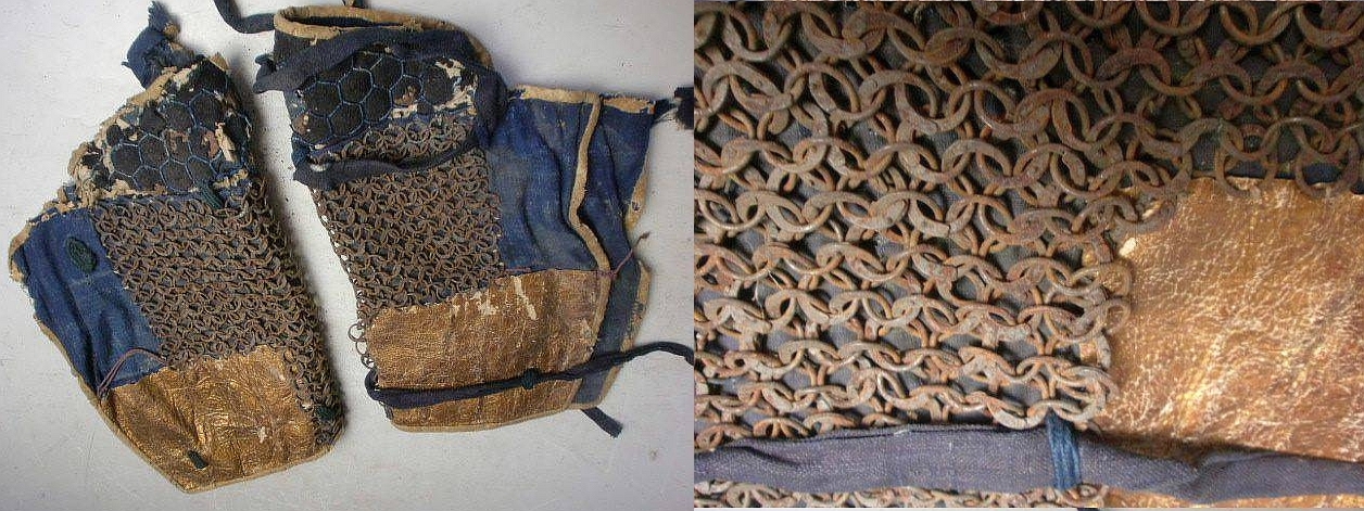 The rarest Japanese armor that I am aware of is riveted Japanese mail. There were up until now only two images available in the world of this armor type. Recently I purchased three matching armor items for the extremities (sangu) consisting of haidate (thigh armor), suneate (shin armor) and kote (armored sleeves). These historical items were being sold in three different auctions and would have been split up never to be seen again. I know of only two reverences to riveted kusari, one in late 1700's book "The manufacture of armour and helmets in sixteenth century Japan" = (Chukokatchu seisakuben) Author :Sakakibara, Kozan,Translated by T. Wakameda ; Rev. by A. J. Koop and Hogitaro Indada, 1912 ; Rev. and edited by H. Russell Robinson, 1962. Publisher London : Holland Press, 1963. pp 83-85. . George Cameron Stone mentions a "kote with riveted European-style 4-in-1'' image # 475.10 in his book "A Glossary of the Construction, Decoration and Use of Arms and Armor: in All Countries and in All Times". The only image of rivered kusari I have seen published is in "Japanese Arms & Armor Introduction by Robinson, H Russell", 1969 P.58 , the image is listed as being an "Early 19th century breastplate from Museo Orientale Venice", in addition Dave Thatcher told me that he has seen this type before in Sasama's big book which I have do not have a copy of and have not seen. The remaining question is whether this example was of Japanese manufacture or was this some foreign type acquired by an Japanese armor maker and used to make this particular armor. The links are not lacquered black as other types of Japanese mail, the links have the appearance of being possibly tinned or galvanized and as to the comparison of other types of riveted mail, the links do not look like eastern riveted mail samples that I have seen or like European riveted mail links. I showed some images of the links to Ian Bottomley and he was kind enough to give an opinion the this looks like it may be riveted mail of Japanese manufacture due to the fact that in Eastern mail the riveted links are connected by solid links and with European riveted mail the links are riveted with a wedge shaped rivet. The mail I have was made with eastern type rivets but all the links are riveted with no solid links. Indian riveted mail European wedge riveted mail