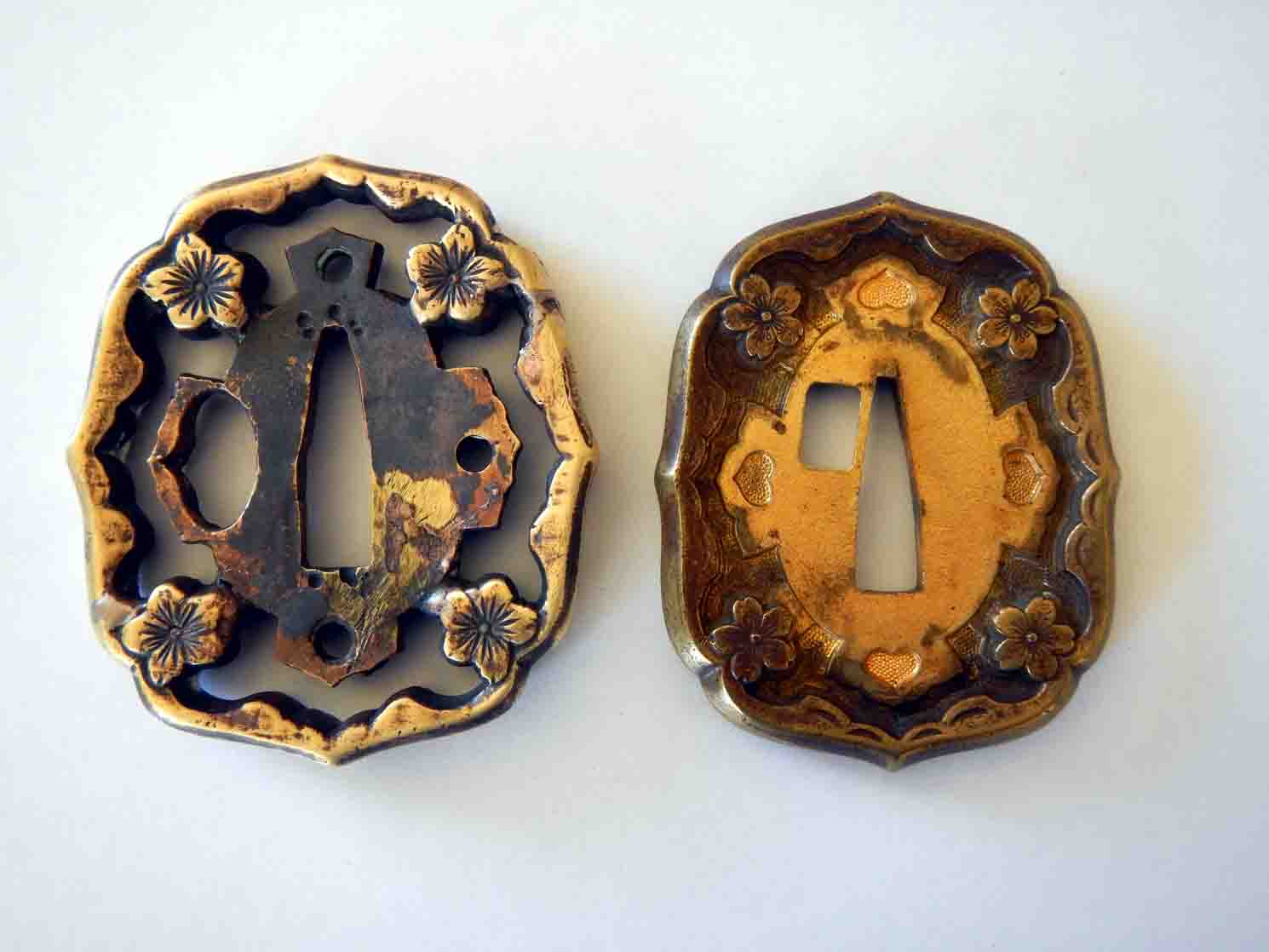 Chriso Posted August 20, 2014 Report Posted August 20, 2014 G'day all, I have two Gunto Tsuba, pics below. The one on the right is solid and fairly well finished off, while the one on the left is a poorer quality, sukashi tsuba that is a tad bigger than the solid one. Any ideas why one is solid while the other is cut out, my thinking is that perhaps the Sukashi Tsuba was produced later in the war and was cut out to either save weight or to save metal which could be used elsewhere ??????? Your thoughts would be very much appreciated Regards and best Chris O Quote