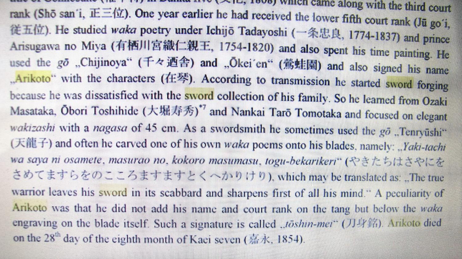 Mark Posted April 5, 2016 Author Report Posted April 5, 2016 with Maurice's direction i found Arikoto in Nihonto Koza, there is an example shown with, what looks like, an identical inscription. The book says that the inscription could not be read, but also said that he inscribed poems on his blades so i guess that is what it is. Thanks! good learning opportunity Picture of the book below Quote