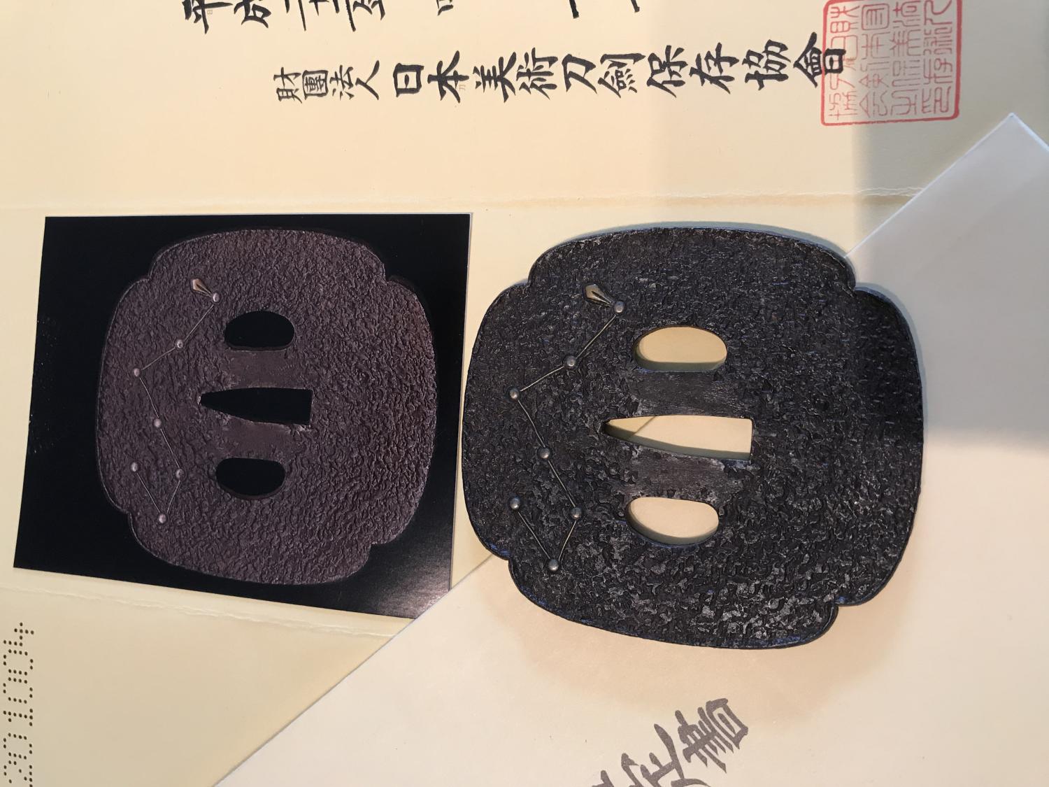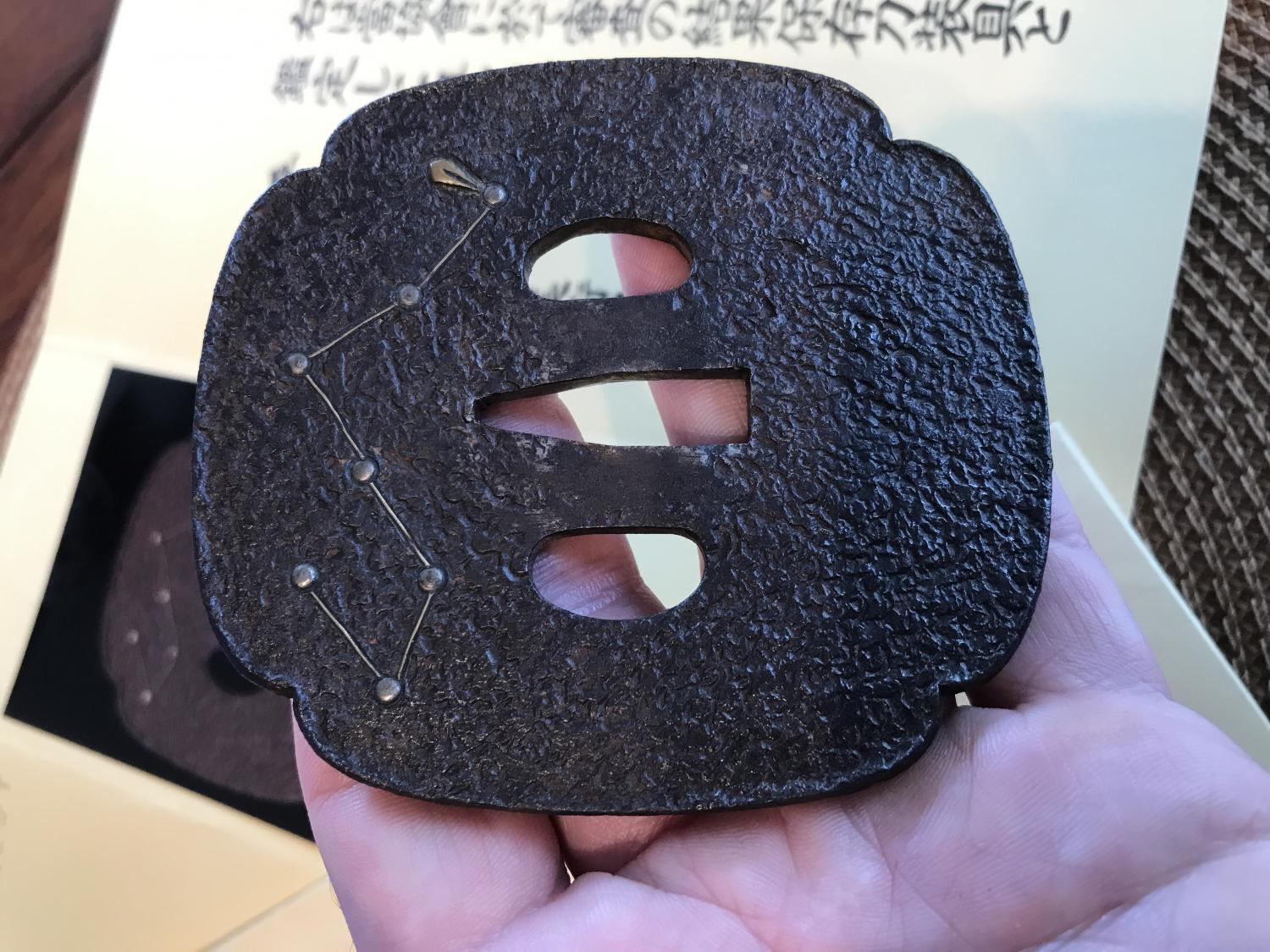 Davidarmy Posted August 23, 2017 Report Posted August 23, 2017 FOR SALE $460 NBTHK Hozon attributed to Kishu Sankei 鐔工, inlay of the Big Dipper Size / Horizontal 8.1㎝ × vertical 8.9㎝ × thickness 0.5㎝ weight 184 D. Easley