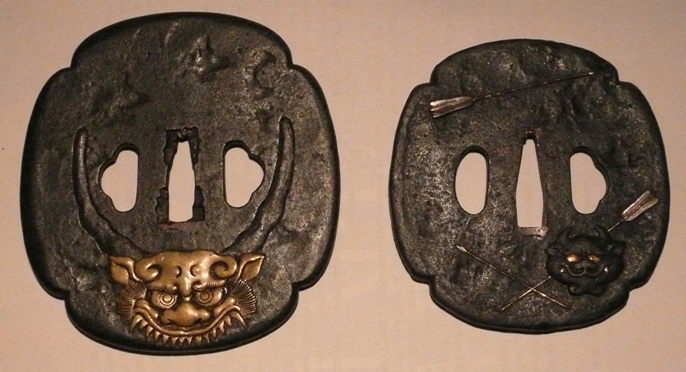 Some of you may be familiar with this tsuba set I acquired years ago. Sadly I must sell it. This is a large set representing an Oni on each with arrows front and back. Dai measures 3 1/2 x 3 7/8 and Sho measures 3 x 3 1/4.