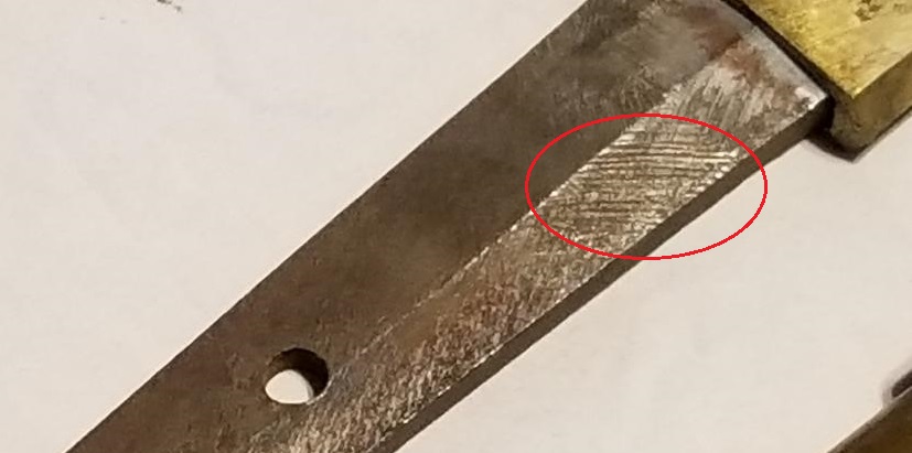 DRDave Posted December 13, 2018 Report Posted December 13, 2018 Bob, I'm reluctant to categorize anything as a loser. I think it's likely a genuine, WW II era sword that is non-traditionally made. The file marks in the area I have circled cause me to suspect that an arsenal stamp has been removed; but having it in-hand, you are better able to judge. 2 Quote