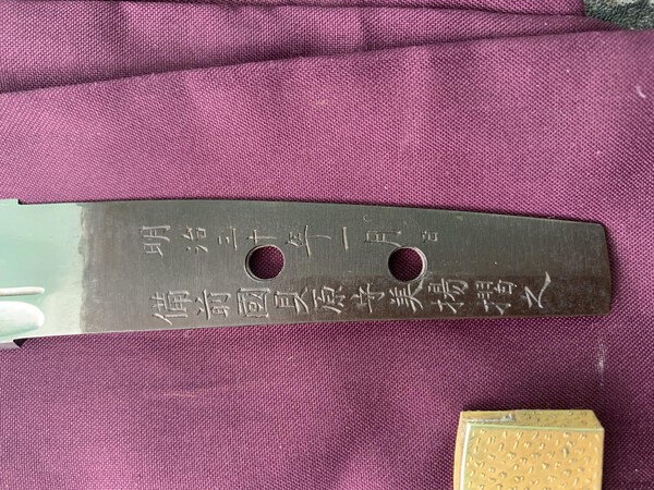 Chishiki Posted August 23, 2019 Author Report Posted August 23, 2019 明治三十年一月日 – Meiji 30th year (1897), 1st month 備前國貝原守美揚摺之 – Bizen no kuni, Kaibara Moriyoshi shortened this. I am not sure about the Gakumei on the other side. That might be Nobukane (信兼 ?). Thank you Moriyama San, i have added more photos of the old mei. I hope someone can help. Thanks Quote