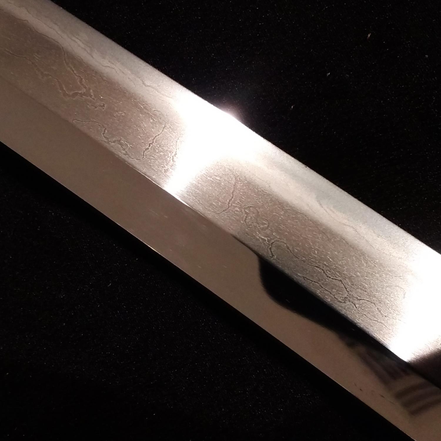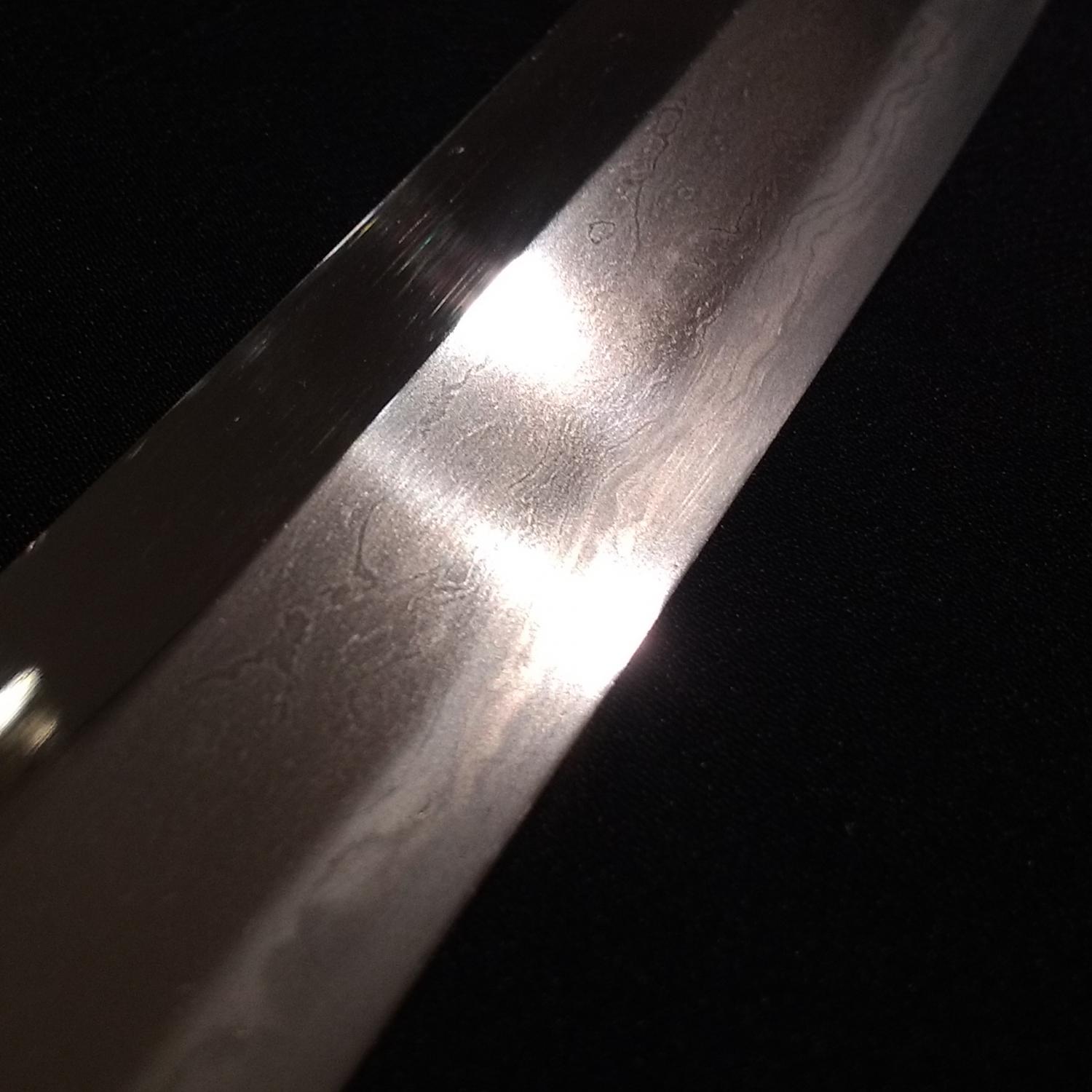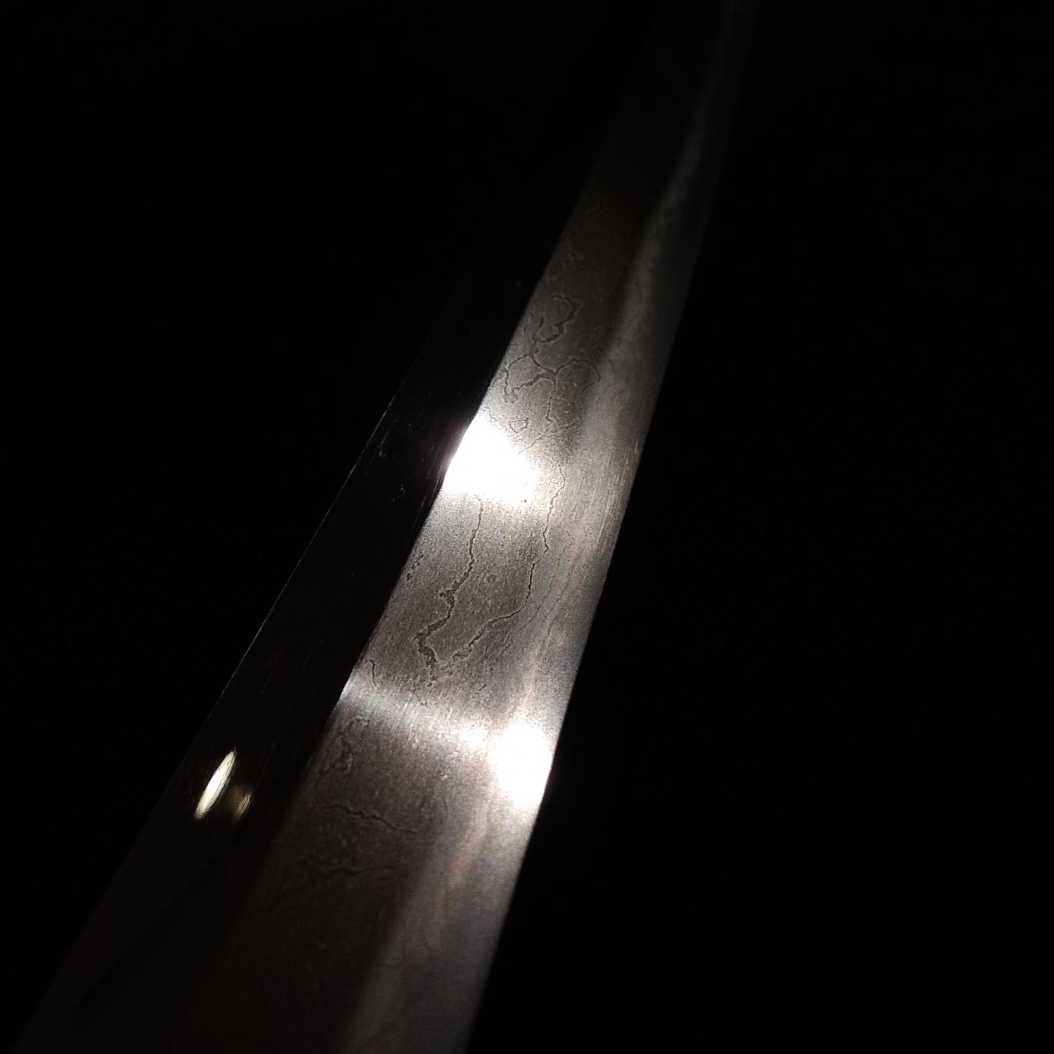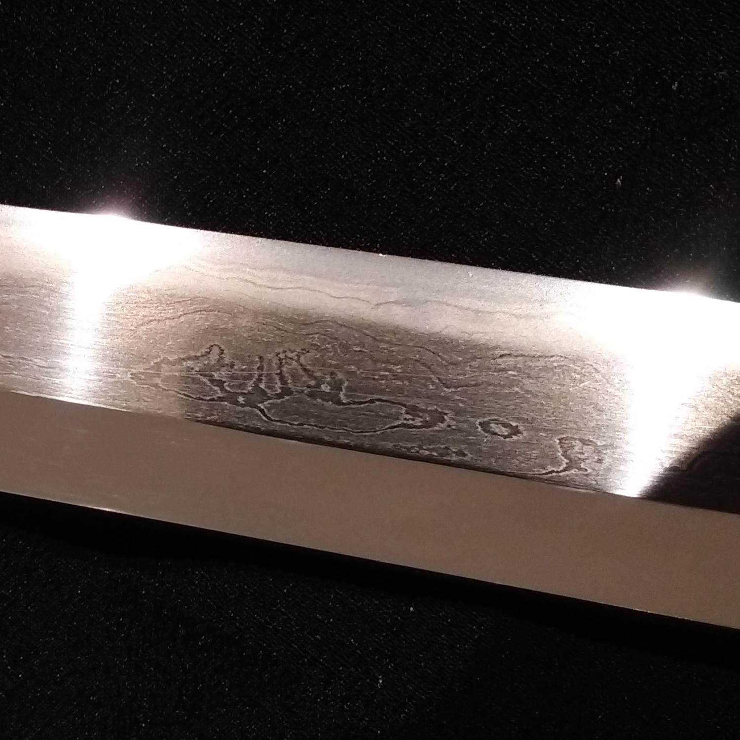 Ray Singer Posted May 23, 2020 Report Posted May 23, 2020 This is an elaborately forged tachi by the gendai smith Hizen Tadaaki. It is clear that he used mixed steel to create a pronounced variation with dark layers in the kitae resembling chikei. The sword has one of the best sugata I have seen in a gendaito. The koshi-sori is deep and he likely wanted to give the feel of a Kamakura tachi. Mounted in an excellent shirasaya with koppa-maki and a gold wash habaki. Mei: Hizen no kuni Tadaaki Nengo: Koki ni Sen roppyaku nen (1940) Additional: ju setsu tan no (along the lines of specially made) $4,250 (plus shipping and PayPal) 9 Quote