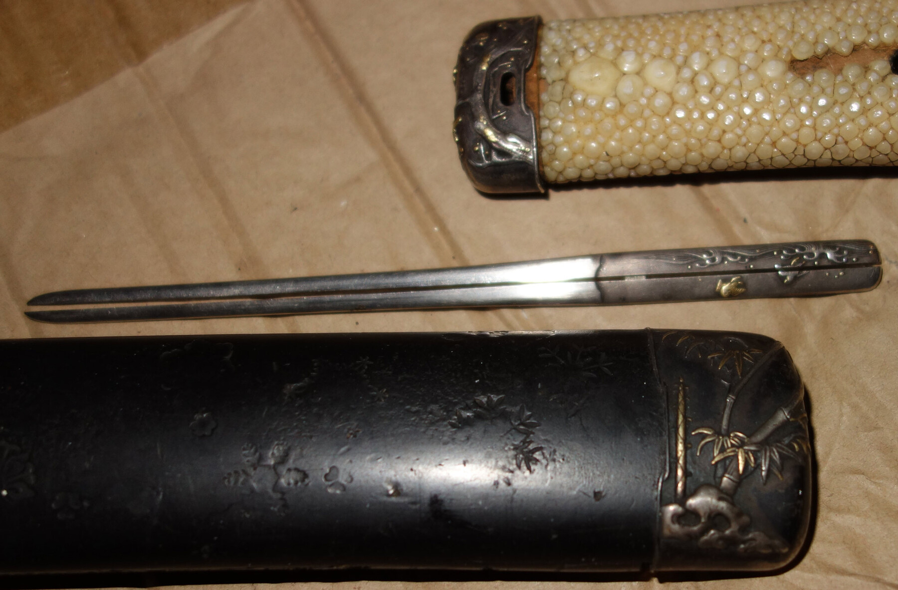 TheGermanBastard Posted February 17, 2021 Report Posted February 17, 2021 I'm looking to complete an Aikuchi Koshirae that has the Koiguchi, Menuki and a Kozuka missing. Theme is birds and ree. Seems to be made of Silver or Shibuichi. If anybody has something matching for sale please kindly drop me a line. Thank you
