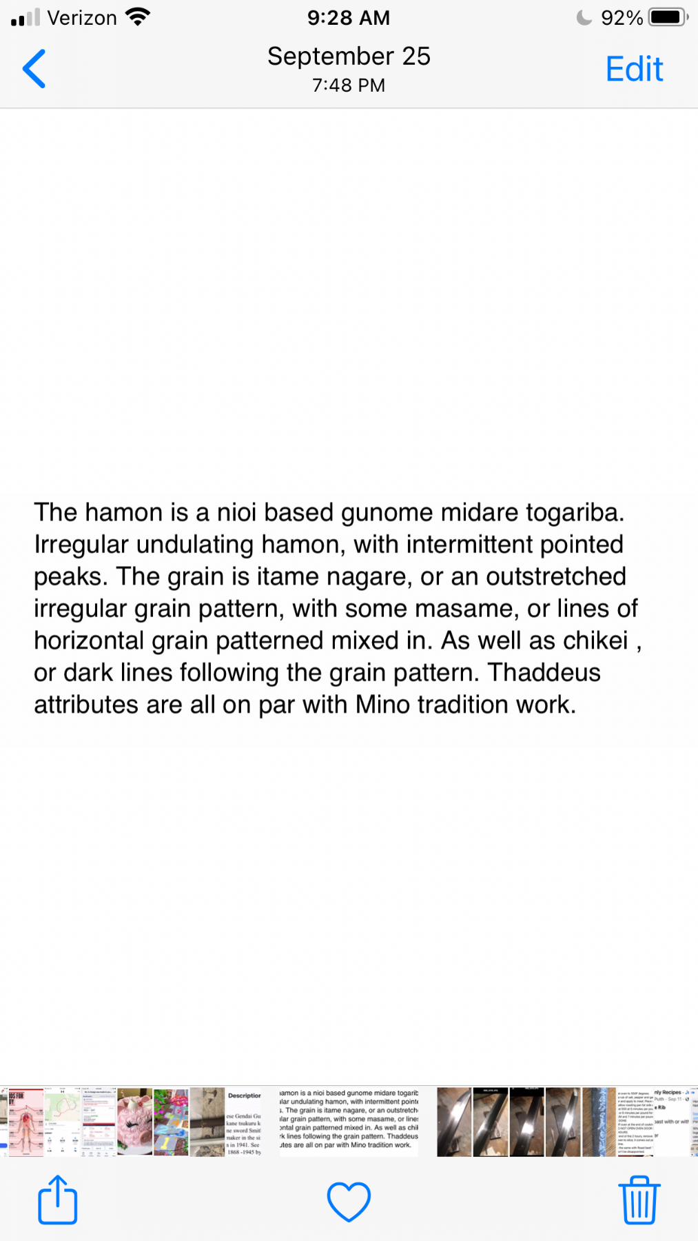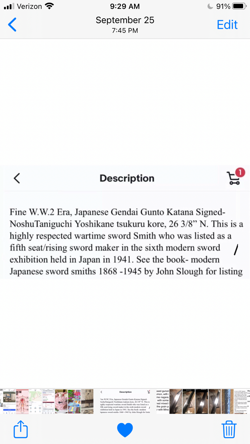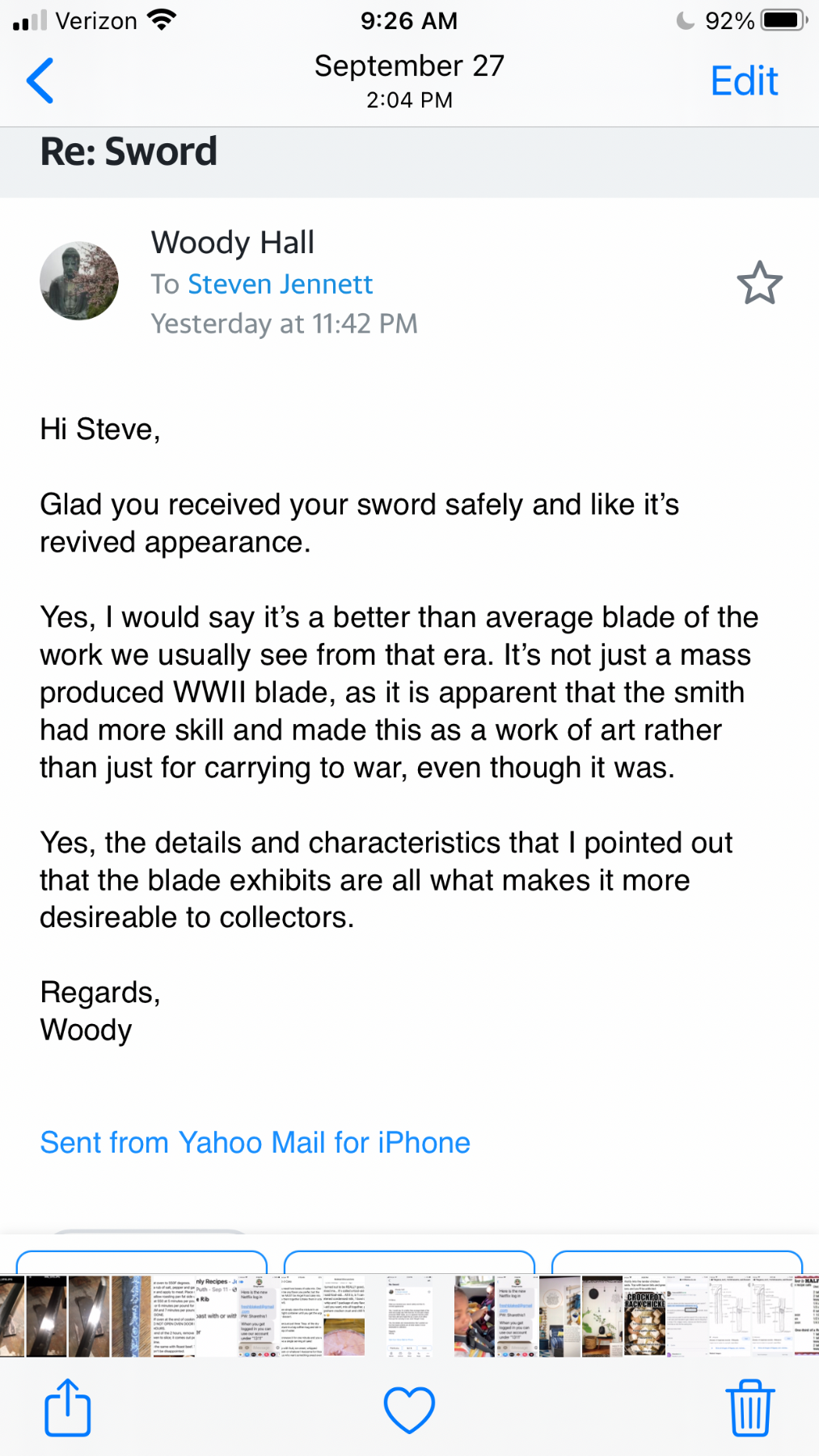 Swords Posted November 21, 2021 Author Report Posted November 21, 2021 Probably shouldn’t of used the sword pictures etc as an example I will break it down for you your comment was Steve, You can read more about the different ways of rating swordsmiths here. I personally don't pay too much attention to "1 million vs 2 million" comparisons, the value is not absolute: you'll see that some swordsmiths are rated high by someone and low by someone else. Of course it's better if your sword is signed by a highly rated smith but that's a plus, the sword should beconsidered on its own merits first. my answer is Thanks good to know what I’m trying to figure out you said by its own merit that leaves the door open I had a sword polish by Woodrow hall that was 5th seat andafter polish it said to be better than averages the hamon showed or the way I interpreted as betterafter polish? as quoted he had more skill dose that mean judged by its own merit? So can it be as good as a one million yen How can you judge one from another? or can a 3rd seat be as good as ist? The smith had to make many swords so how can they be all the same And that smith probably had others sign for him ! I added pic below I’m open for discussion Quote