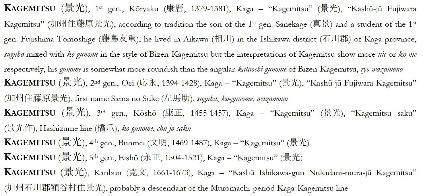 FZ1 Posted April 12, 2022 Report Posted April 12, 2022 This Tachi was offered by a well-respected dealer in Japan. Mei Mumei, attributed to Kagemitsu from Kashu Shape Shinogizukuri Iorimune, Typical Tachi Shape with Koshisori Region Kaga Province Era Namboku-cho Period Length 83cm 32.7 in Sori 3.6cm 1.4 in Motohaba 3.1cm 1.2 in Sakihaba 1.9 cm 0.7 in Mekuniane 0.7 cm 0.3 in Jihada Itame-nagare and Mokume with faint Utsuri Hamon Kogunome-midare with Konie, Ashi and Yo Bōshi Almost Sugu, Turning a bit sharply Nakago Ubu, Kiji-momo shape, Sujikai file pattern and a Kurijiri end Mekugiana 1 Habaki Copper base gold foil Tachi Habaki Status/Date NBTHK Hozon Token / 31 Jan 2013 Responses from the dealer to some general questions: There are several kizu/kitaeware flaws on the blade and they are visible through the images. However, I can tell you that there is no serious flaw. Considering the history, current conditions are quite natural and tolerable. This blade was forged in the Nambokucho era, over 600 years ago. It has a rich history and compared with other swords with the same tachi, it is natural. The Hamon and the Boshi are clear and the faint Utsuri is visible. In hand, this blade appears to be mature and robust. This answer was in response to a question about the partially erased Kikumon/Ichi: It is not a Kikumon, but someone probably engraved Kikkumon and ichi to try to be recognized as a Kikugosaku. Kikugosaku swords mostly became national treasures, which were forged for the Gotoba Emperor in the early Kamakura Period. I think the style and shape of the sword resembles that. Later, it appears as if someone tried to grind the non-legitimate Kikugosaku, but you can still see a little of the symbol. NBTHK recognized it as Mumei and not Kikugosaku. I’d appreciate thoughts on this blade from those more experienced than me. I’d be most grateful if any critique of the blade is constructive, i.e. please provide reasons for your thoughts, so that I can learn from them (dismissive one-liners add nothing to my knowledge!) I attach photos from the dealer, an image of the Hozon paper and (for convenience) the Sesko and Hawley references for the Kashu/Kaga Kagemitsu smiths. Thanks, Jon 1 Quote