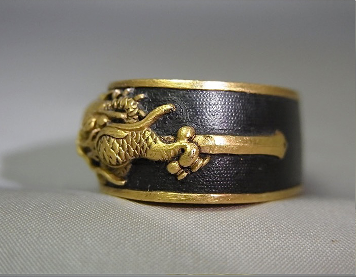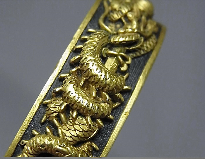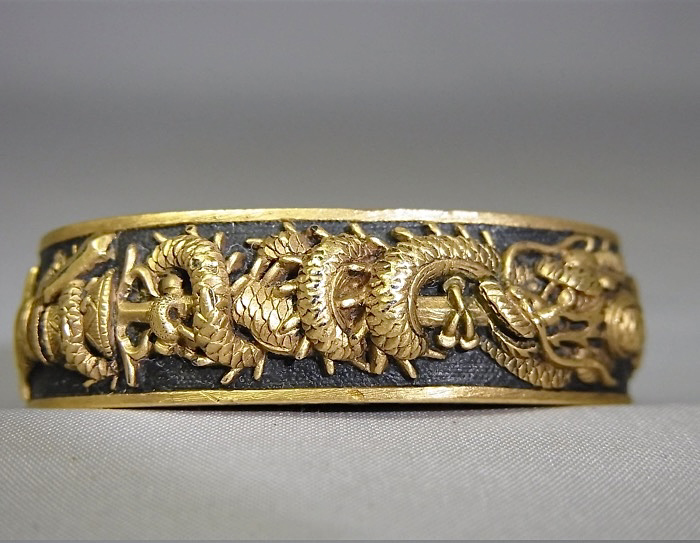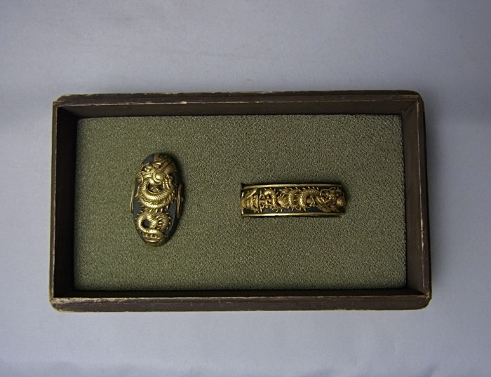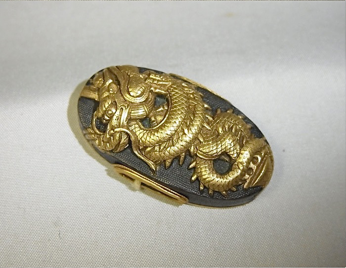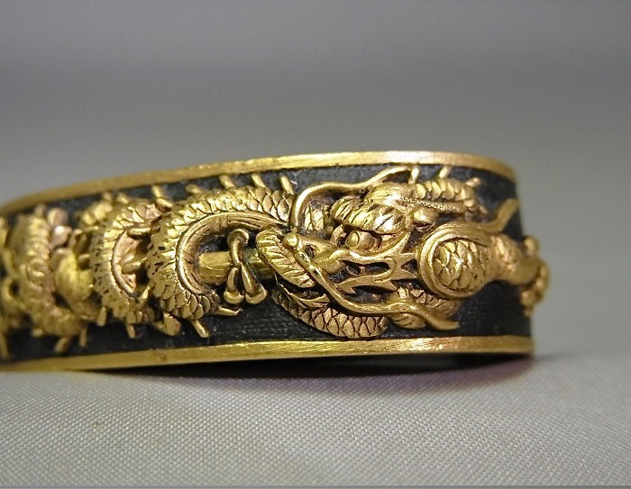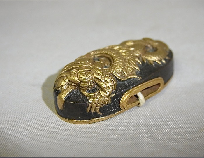 Marco Posted September 24, 2022 Report Posted September 24, 2022 Fuchi Kashira depicting the Kurikara Dragon. The Kurikara Dragon is a form of Fudo Myo which takes this form to defeat the other religions (by eating the sword). The legend says that Fudoo had to fight the representative of a different religion. He changed himself into a flaming sword but the opponent did the same so Fudoo changed himself into the Dragon Kurikara and started eating it from the top. Measures manually taken from the edges (please consider a minimum of tollerance) Fuchi: 3.77 x 2.20 x 1.08 cm. Kashira: 3.40 x 1.8 x 0.93 cm. Price for the members of the forum 900€ (on facebook I'm selling it for 1100€) + paypal (bank transfer accepted) + shipping. Located in Europe.
