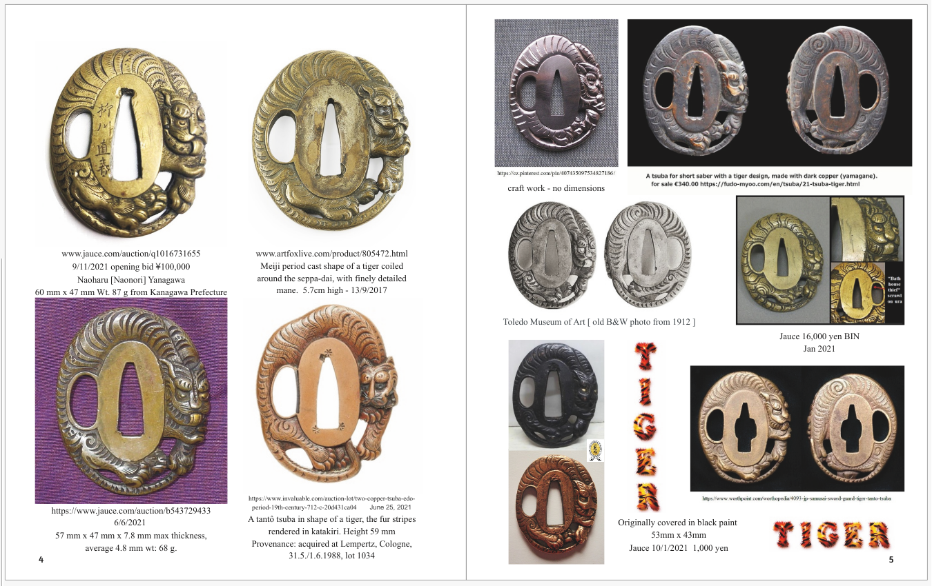 Spartancrest Posted January 3, 2023 Report Posted January 3, 2023 The Japanese have a long tradition of "Utsushi" - which at its simplest is to make an 'emulation' [not a copy]. There is usually some little difference between the 'original' and the later model though sometimes it is darn hard to find the difference. There were also a lot of copies made but these were usually meant to deceive the uninformed [ie. Europeans!]. There are numerous examples with tsuba where the 'original' design was made over and over again by either students or even different schools. I have seen Fuchi/Kashira utsushi so it is not unlikely that many other parts were likewise made with the same designs. I don't collect Kozuka [not Kazuka ] so I can't help from that aspect. https://publicdomainreview.org/collection/unai-no-tomo As for Utsushi - this is just one example of Tiger tsuba - and my book is already 220 pages of other utsushi designs including one example of 'rain dragon' where I have 98 examples each entirely the same design but each one individual in execution. [hoping to make it 100 to round it off this year!] 2 Quote