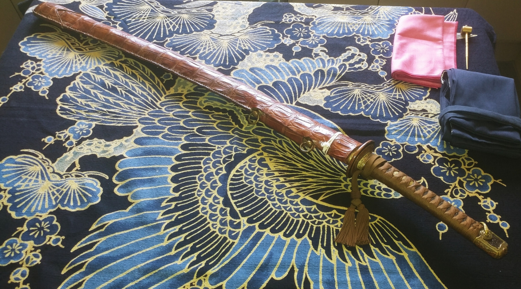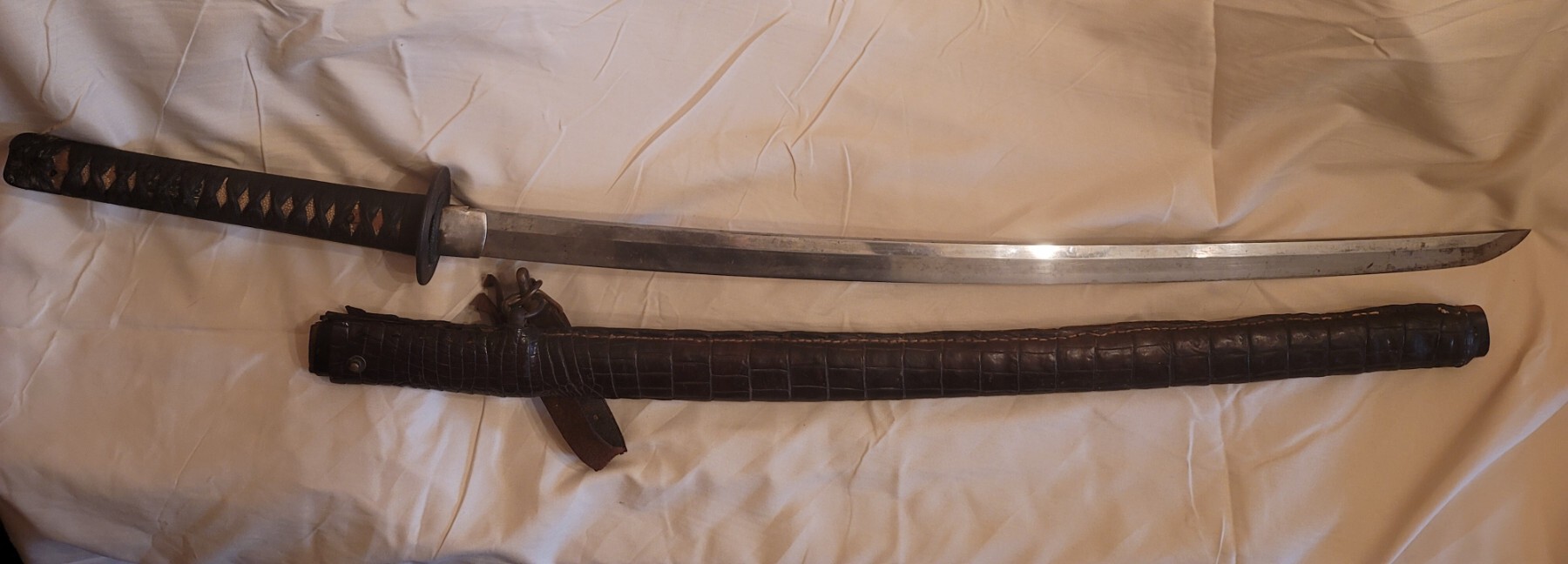 PNSSHOGUN Posted July 10, 2023 Report Posted July 10, 2023 Hi Frank, interesting sword, thanks for sharing. The cover was likely made in the field from salt water crocodile skin, perhaps on one of the major islands of the former Dutch East Indies. Here is a Kai Gunto surrendered on Balikpapan with a similar field made cover from crocodile skin. Do you have any further information about how it was acquired? The blade itself may have have potential, there is significant machi-okuri (habaki moved up to create a longer handle) which looks to have been done fairly crudely. Keep it oiled with a light gun oil and whatever you do, don't attempt any restoration yourself. 2 1 Quote