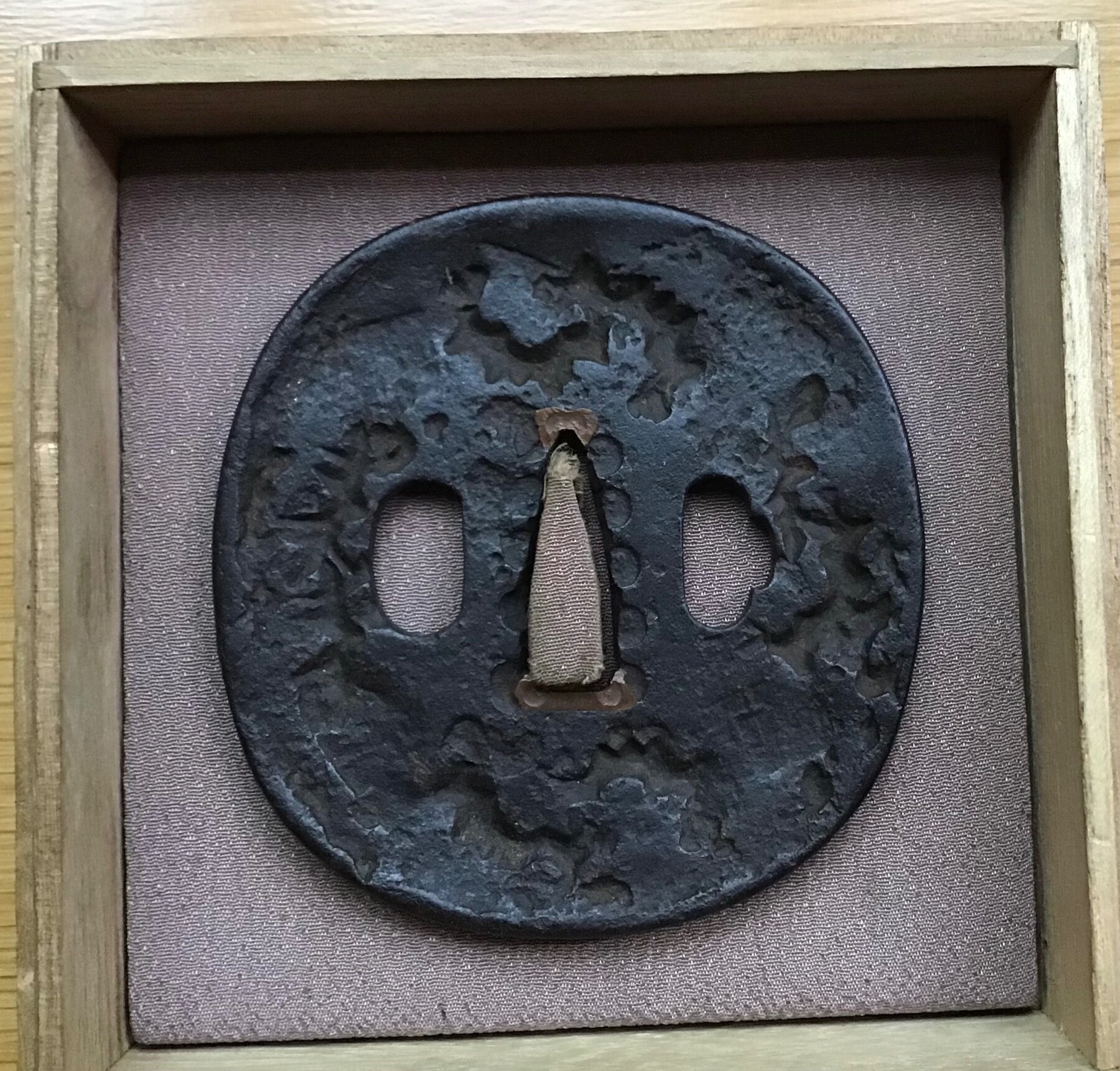 Matsunoki Posted August 1, 2023 Report Posted August 1, 2023 Hello again from a cold and damp UK. If any of you out there are in any of the “heat zones” I hope you are safe and OK. I’m not really sure why this one appealed to me but I was intrigued by the rather “brutal” appearance of this large (armourers?) katana tsuba which I think could be from the Tembo school? There are incomplete traces of hot stamps amongst the other heavily impressed elements. Any views or comments? What age? What do the irregular deep impressions represent? Many thanks and all the best. Colin 3 2 Quote