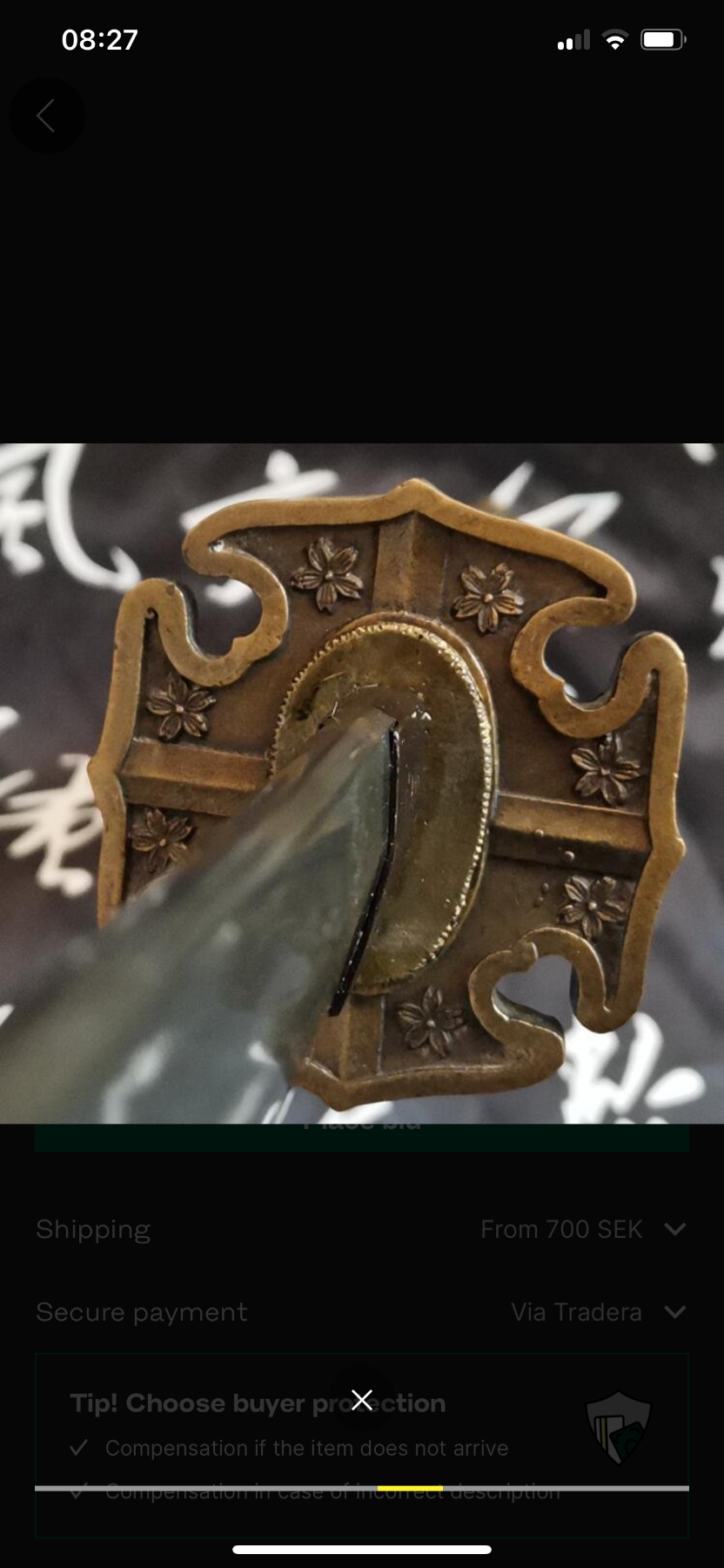 Buhnevici Posted March 24, 2024 Report Posted March 24, 2024 (edited) Hello good people! I have a question regarding the sword in the picture. The stamp looks military (and fake?) but I wondered if it was in any way normal to inscribe a name as it is (Hideya..?) instead of on the tang. i’m sorry if these are obvious questions but I know very little. Could this be a regular factory made officers katana? The tsuba and ray-skin and other details seem to be of much higher quality than I would expect in a reproduction as well. Respectfully from Sweden, Alexander Buhnevici Huijserius@gmail.com Edited March 24, 2024 by Buhnevici Spelled sword wrong Quote