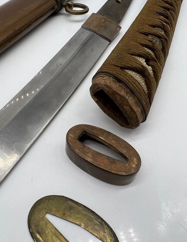 Bruce Pennington Posted April 18, 2024 Report Posted April 18, 2024 13 hours ago, Tensho said: The hanger is also mounted for the blade to be worn edge up. Good eye, didn't notice that before! This is the third one I've seen this year mounted that way, though I don't recall what type of fittings the other 2 were. Smith is Yoshiomi, and the Showa stamp should mean the blade was made in '40-41 plus or minus. So if these are late-war fittings, which they seem to be, the blade must have been re-fitted into this. The alternating folds of the tsuka indicate it was Japanese made. Many of the low quality fittings we see from occupied territories have the Chinese style folding, going one direction. I'd guess this was something done in the last year of the war. Working from memory, I believe both Dawson and Fuller have examples of creative variations that this item would fit quite naturally in with. 1 Quote