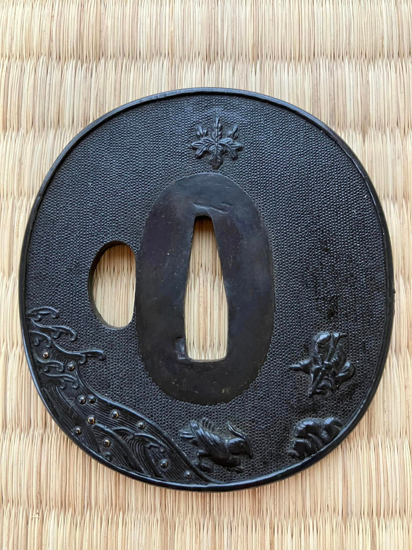 kyushukairu Posted October 15, 2024 Report Posted October 15, 2024 This Momoyama-era tsuba is in exceptional condition for it's age, and is very well made. Solid shakudo plate with fine shakudo, depicting the interface between land and sea. 72x67mm £250 1 Quote