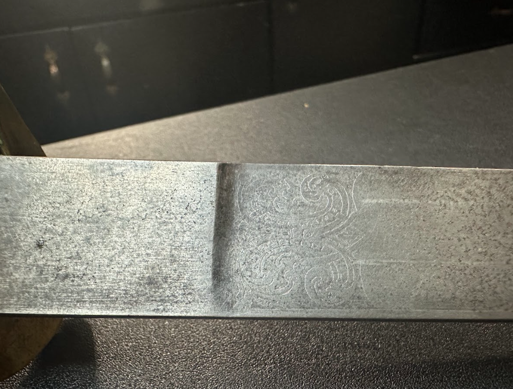 TheGameDev Posted July 1 Report Posted July 1 Hello, I have an inherited blade that I'm trying to identify. The story of the blade is that it came back with a WWII veteran and belonged to a Japanese Imperial Officer The hilt and scabbard have an acorn motif with animal hoofs at two points. The blade does not appear to have a maker's mark (that I can tell) but has filigree engraving and I can make out engraved foxes in a forest through the rust spots. The entire weapon from pommel to tip is about 18 inches long. Any assistance identifying the blade, it's history, meaning, and potential value would be greatly appreciated. I have many more images and close-ups of each part but could only upload these three images to start with. Quote