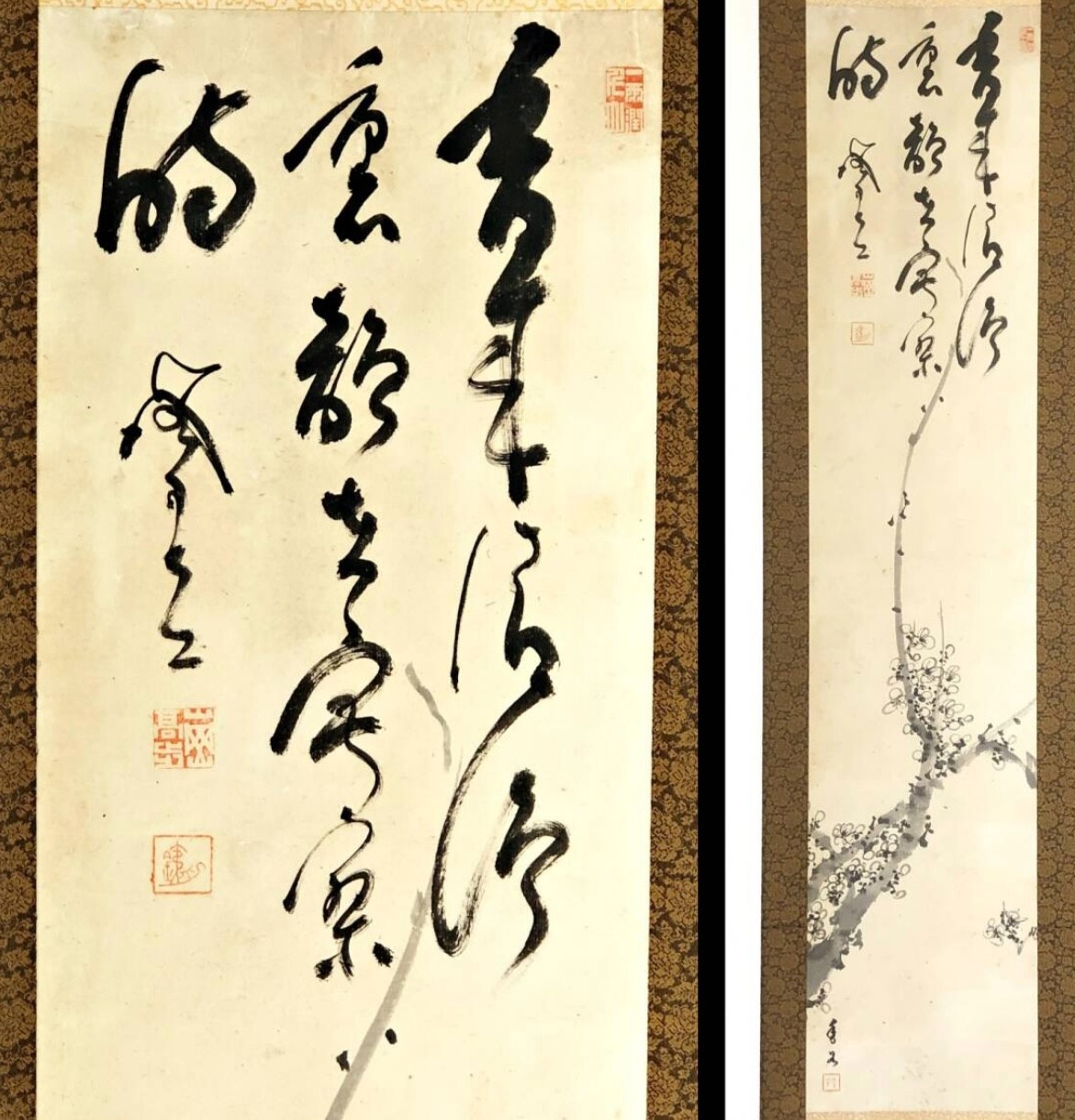 Iaido dude Posted September 3 Report Posted September 3 I'm working my way through my collection, posting nice pieces by Zen Masters and Buddhist Nuns that have a remaining element of art history mystery, in the hopes that our community can help to fill in the missing pieces, while allowing opportunity for communal art appreciation and learning that is so relevant to the Japanese aesthetic running throughout NMB. Yamaoka Tesshu (山岡 鉄舟), 1836-1888. This delightful work is purported to be a collaboration between Yamaoka as the calligraphy and his eldest daughter, Koya 香谷 (Fragrant Valley?) as the painter. I cannot make out the calligraphy, but presumably it refers to some aspect of a blossoming plum (or cherry) tree. According to Yamaoka's family tree in the firsthand account 女士道 : 鉄舟夫人英子談話 (published 1903, but I can't find this) of his wife Yamaoka Fusako (山岡英子), he had 3 sons and 3 daughters, but I'm not sure that Koya is among them unless 香谷 is an artist name if indeed that is the mei. There is, another prominent artist of the Nanga-school named Murata Kōkoku (村田 香谷, born as Murata Shuku 村田 叔, 1831-1912) who would have lived during the late Edo- and early Meiji-periods when Yamaoka was active, but the mei and seal below the painting don't support this attribution. If these two types of work weren't produced at the same time, I think that it is more likely that Yamaoka brushed calligraphy on the painting rather than the other way around, but they look to have been done together. On this work,Yamaoka's uses a seal in clerical scripot that doesn't appear very often, but it matches that used for an inscription with mei that he brushed for a formal portrait made when he was 51 (1886)--two years before his untimely death. His mei also corresponds to that time period, having evolved steadily, especially after his enlightenment experience at age 45. 3 Quote
