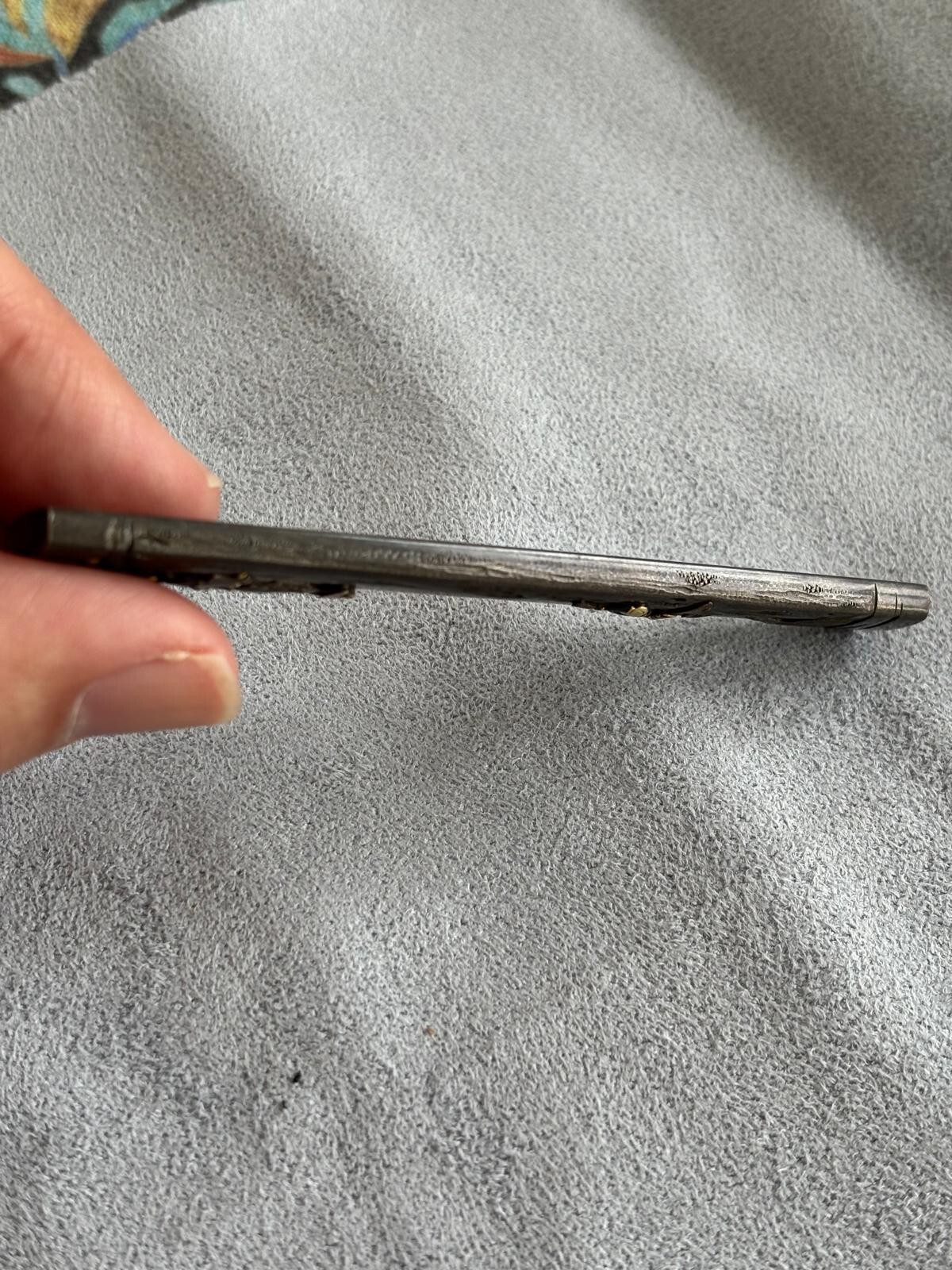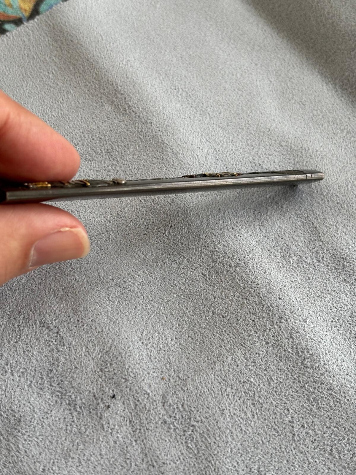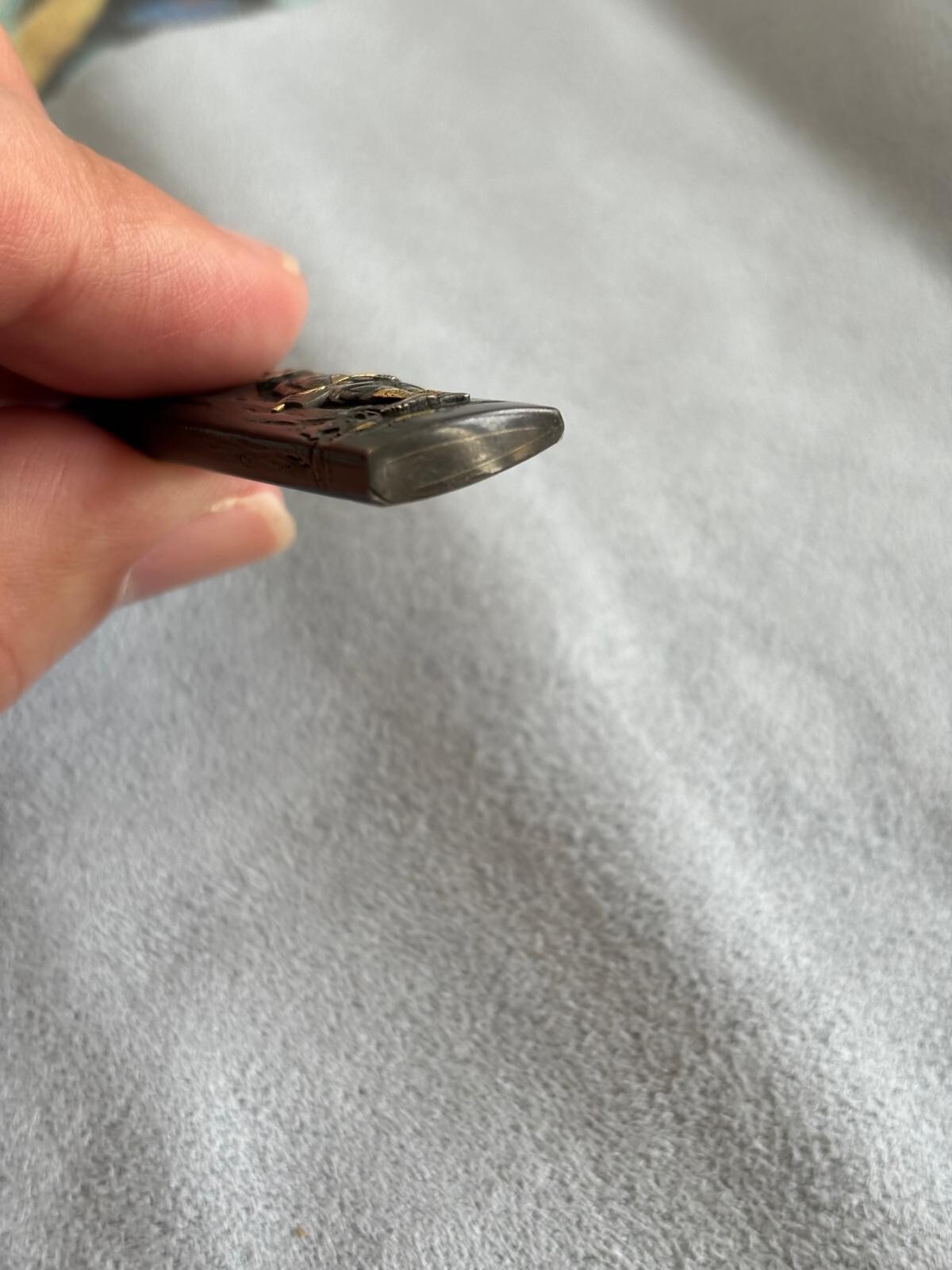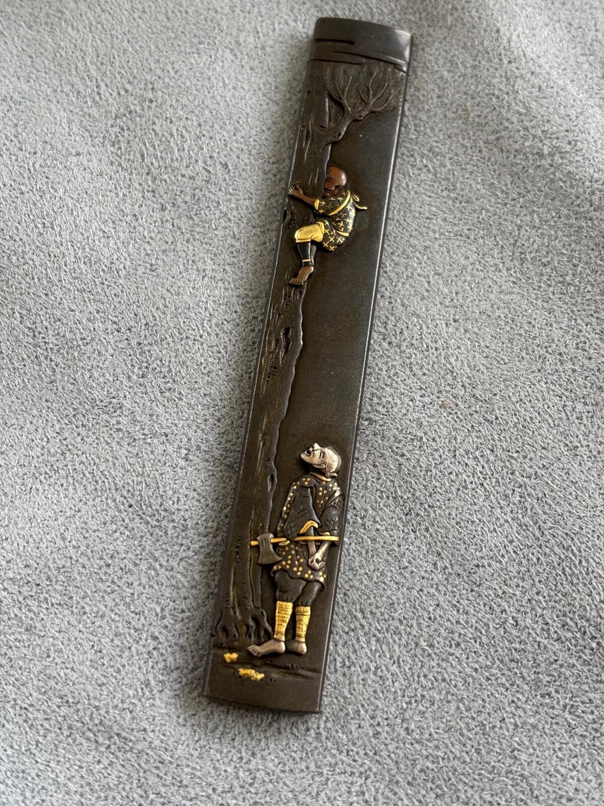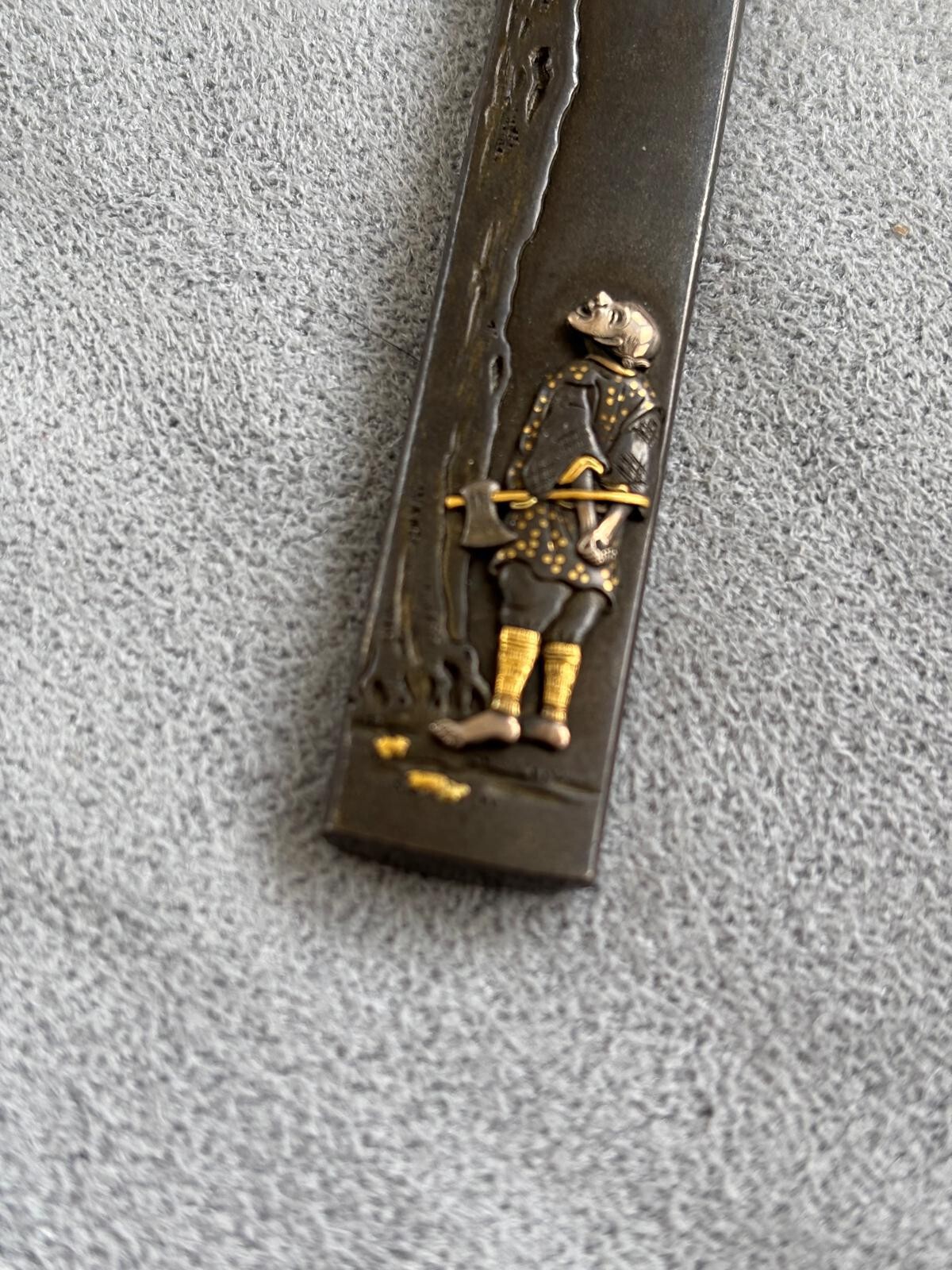 LeonLop Posted September 12 Report Posted September 12 1x Hamano School Kozuka signed: Sadayuki 貞隨 (Man in a tree above a wood cutter (Furusoma?) c1850) Metal, shibuichi migakiji with shakudo, gold, silver and copper 9.6cm. Sadayuki is a maker featured in the Claude Thuault Collection 'Kozuka 100' see No.35 page 94/95 € 1,750 OBO plus shipping GBP 1,500 OBO plus shipping US$ 2,050 OBO plus shipping Please feel free to message me with any questions. The Kozuka current resides in Australia Thank you and Regards, Leon 2 Quote