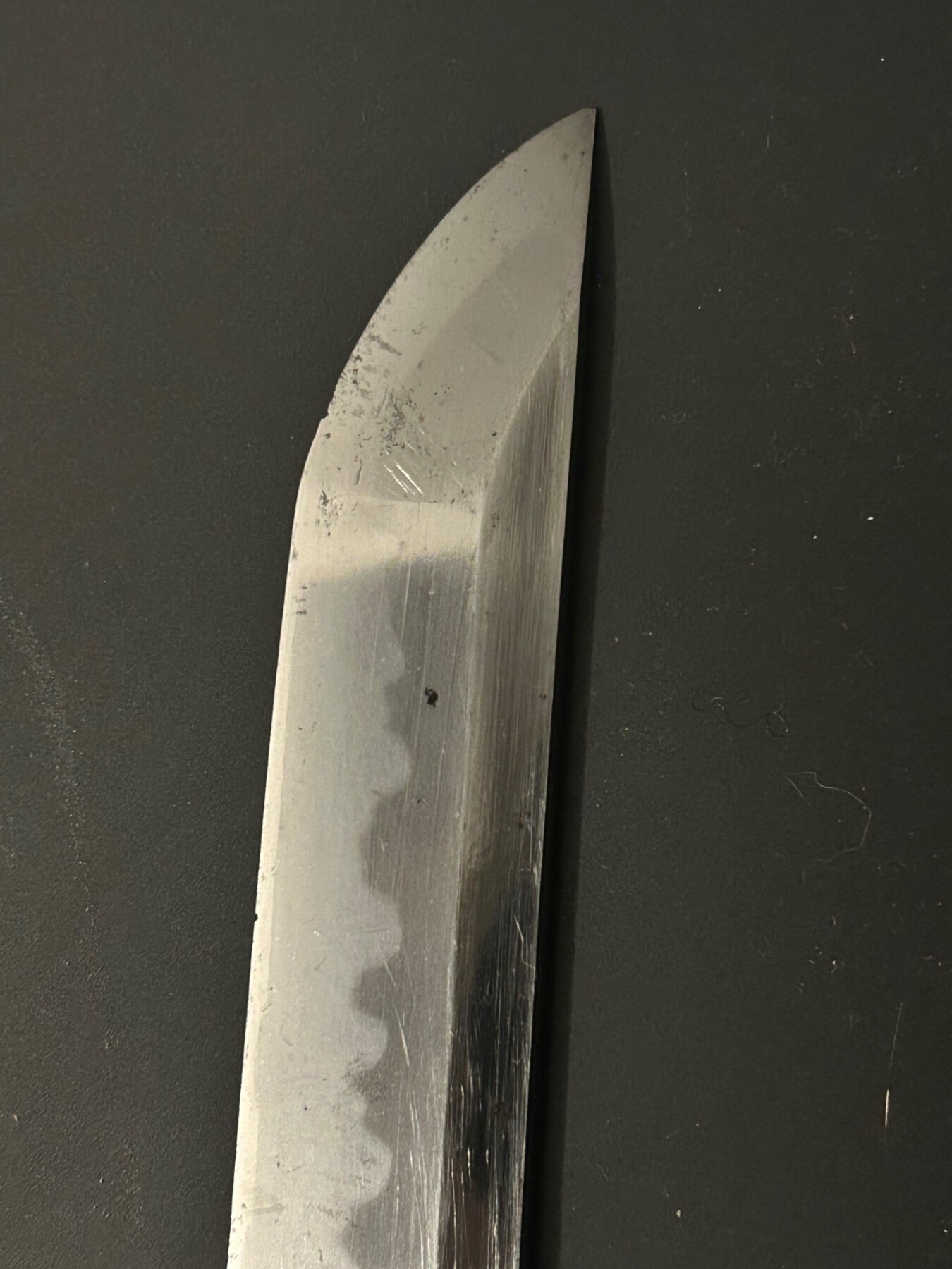 Scogg Posted October 31 Report Posted October 31 Hi Cody, well done on the photos! Grey's advice is very good. Consider that the sword has existed for many generations before you, and it will continue to survive many generations into the future; so plenty of time to learn before any big decisions are made. (A professional traditional polish can be as much, or more than $150 an inch, (150 x 23 = ~ $3450). Your sword is already in decent condition, and is better looking than most "first swords" that we see. The two peice habaki is a nice bonus, and the fittings are charming enough.. When a mei is genuine, it's referred to as "zaimei", when it's a false signature it is called "gimei". I do not personally have the expertise to determine zaimei from gimei. You could try comparing your signature to known papered examples, but that's a little advanced (maybe someone here will offer input). Your sword is original length (ubu). Without a doubt it is a real and traditionally made Nihonto Wakizashi. Thank you for sharing, and welcome! All the best, -Sam 1 1 Quote