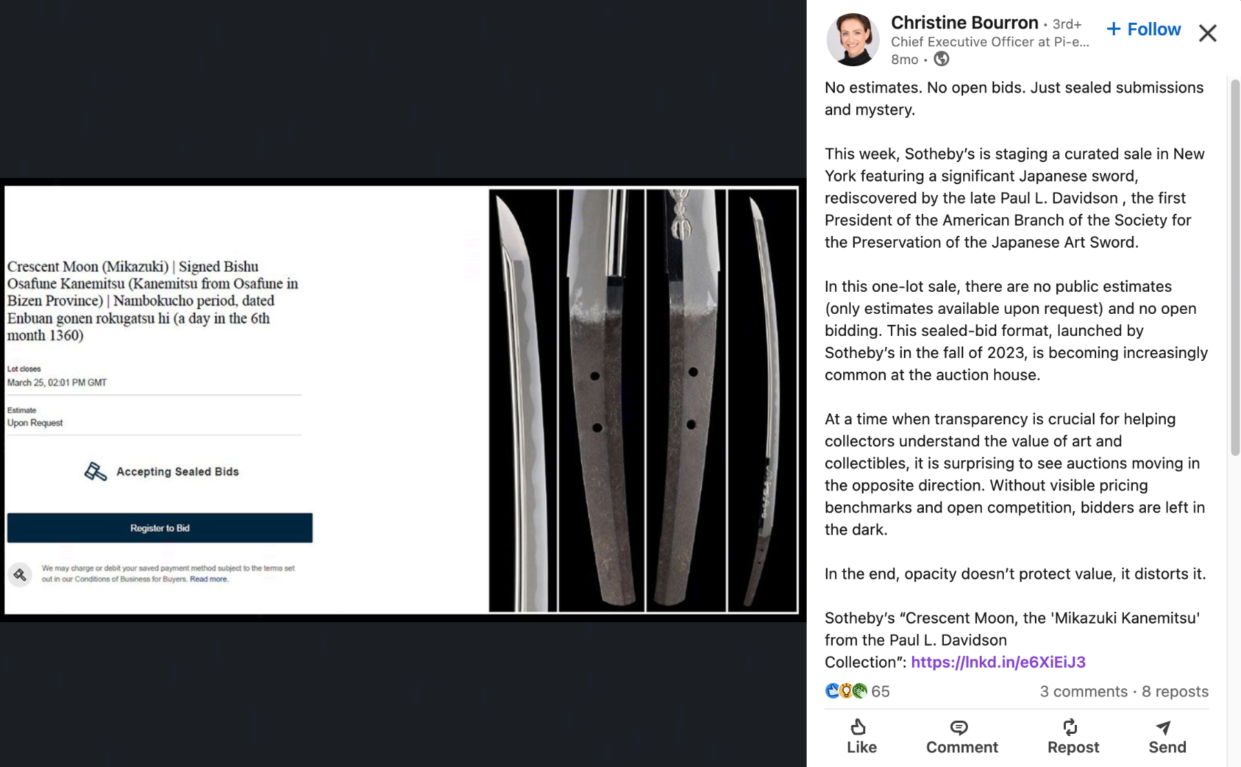 Matsunoki Posted Monday at 01:34 PM Report Posted Monday at 01:34 PM 36 minutes ago, MassiveMoonHeh said: I know for damn sure that an open market pushes prices a lot higher than closed private sales. I don’t want an argument but this is not true when dealing with clients that are perfectly happy and well prepared to pay a premium for exclusive private buying opportunities. Also many dealers do not wish it known that they sold “sword X” to “customer Y” for “$Z” Not everyone wants exposure to the limelight. It’s the same in any high value commodity market. The art market operates in a very similar way. Imagine you are a dealer with many high net worth private clients…….the problems that could occur when your clients find out what you have sold to their rivals etc. You stand to lose your best customers. 47 minutes ago, MassiveMoonHeh said: Transparency is key. Transparency can work negatively as well as positively……it can depress a market if the “prices” start to fall - because there is no guarantee that sword prices will rise especially in this world. We have seen a few very decent collections hit the open market in the last year or two with pretty gruesome results……high percentage of unsold….likely caused by vendors expectations. And, what effects of age demographics will we see……will younger collectors be interested (or able) when these high value swords come onto an open market? Or will they prefer a new Porsche? It’s a complex set of circumstances. 3 Quote