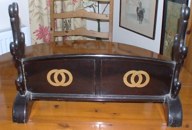 Lindus Posted September 26, 2011 Report Posted September 26, 2011 This stand came to me via a great old fellow who lived in a tiny cottage surrounded by some great stuff {see Warabite-To},according to FAT it came from Germany in the late twenties, a present from a "princeling" {his words} who fled Germany bringing a large oriental collection with him. Frank was loaned by his university in Oxford to catalogue the mans collection but this is a long and strange story for another day. When finished the story goes that a chap driving a Hispano swiza {?} presented him with a case containing four sword,one hundred assorted menuki,fifty Tsuba and one sword stand. Now to the question, the black lacquer is becoming brown, I have seen old lacquer where the undercoating is red to show through but mainly due to over zealous polishing,this has never had more than a dusting. At 55cm between support sections it was designed for long swords and although Frank thought it to be 17th century I have not a clue other than it is at least eighty years old. Any ideas gentlemen?. Regards Roy Quote